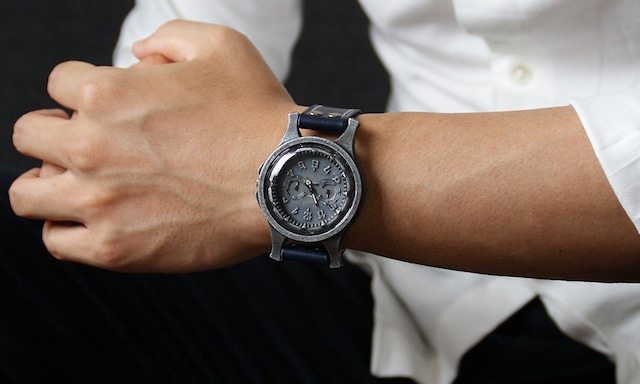 アンティーク風の時計で、私たちの集大成として制作をした腕時計。 デザインはなるべくベーシックでシンプルにしながら、日本語での曜日表示などの工夫を散りばめたスリーアイの時計で、本体文字盤すべてを金属で制作し、アンティーク風に仕上げました。 写真はすべて男性がつけた写真です。 「時計本体」・・・アンティークシルバーに仕上げています。 時代を経たようなアンティーク風のシルバーで、落ち着きのある、少しざらついたようなシルバーです。ピカピカのシルバーよりも、腕によく合います。 「文字盤」・・・本体と同じアンティークシルバーですが、本体よりも深みのある、立体感を感じるように仕上げています。 実現できるギリギリの高さで、できる限り、立体感を出した文字盤です。 日本語の曜日表示はデザインを保つのが難しいのですが、オリジナルフォントを用いることで、うまく溶け込ませることができたと思います。 「時計の針」・・・ダーク一色の時計なので、時計の針はクラシックながらも、蓄光部分をプラスすることで、見やすくしました。 「裏蓋」・・・裏蓋は、金属で制作したあと、腕に直接多く触れる箇所なので、塗装を施しています。色は消墨色で日本の伝統色で仕上げました。 「美しく柔らかい馬革プレミアムベルト」・・・馬革の柔らかい手触りのベルトです。 メタリックで大人の雰囲気のこの腕時計には、この革のベルトがよく似合います。 ステッチ(糸)の色は固定です。 「撮影に使用したベルトの種類」・・・今回、この時計には、「プレミアムブラック」を合わせて撮影しました。 お好きなカラーをオプション欄からお選び頂けます。 (商品の仕様) サイズ: 男女フリーサイズ(腕14cmから18センチcmをカバー)です。 素材 : 馬革、真鍮、樹脂コーティング紙、ステンレス、アクリル、ゴム、ポリエチレン、鉄 ムーブメント: クォーツタイプ(電池で動く一般的な時計です) 塗装: メッキ加工:金属を腐食させて磨きます。:金具や裏蓋等一部は塗装。 時計サイズ: 時計本体4.5センチ(外周円周部分)。文字盤3.5センチ 重さ: 約89グラム(くるき亭の時計の中では重い方です。) 電池交換: 出来るだけ、くるき亭での交換をオススメします。 お届けまでの期間: オーダーを頂いてから制作するため、現在10日間を頂いております。 備考: 月が31日未満の月は日付を合わせる必要があります。合わせ方等は、くるき亭のサポートページをどうぞ。 時刻・曜日の合わせ方 リューズ(時刻合わせのネジ)を軽く2回引いて、リューズを回すと、時刻がまわります。 時刻を回すと、0:00〜05:30の間に曜日が変わりますので、時刻をぐるぐる回して、曜日を合わせてください。 ※ リューズの操作は優しくお願いします。 ※ 日付や曜日の針と目盛りが若干ズレるということがあります。これは当店の時計に限らず起きる現象で、不良ではありません。不良の目安は「違う日付や曜日を指す」となります。 曜日を合わせる際のご注意 曜日を合わせる際は、上記のリューズの操作にご注意頂くと共に、AMPM(午前午後)に注意してください。 間違えてしまいますと、お昼の12時頃に、日付と曜日が変わってしまいます。 もし、お昼に日付が変わってしまった場合は、今一度、時刻を合わせて下さい。 日付の合わせ方 リューズを軽く一度引いて、反時計回り(下向き)に回しますと、日付をあわせることが出来ます。 この際に、時計回りに合わせてしまいますと、日付(歯車)が回らず、壊れる恐れがございますので、ご注意ください。