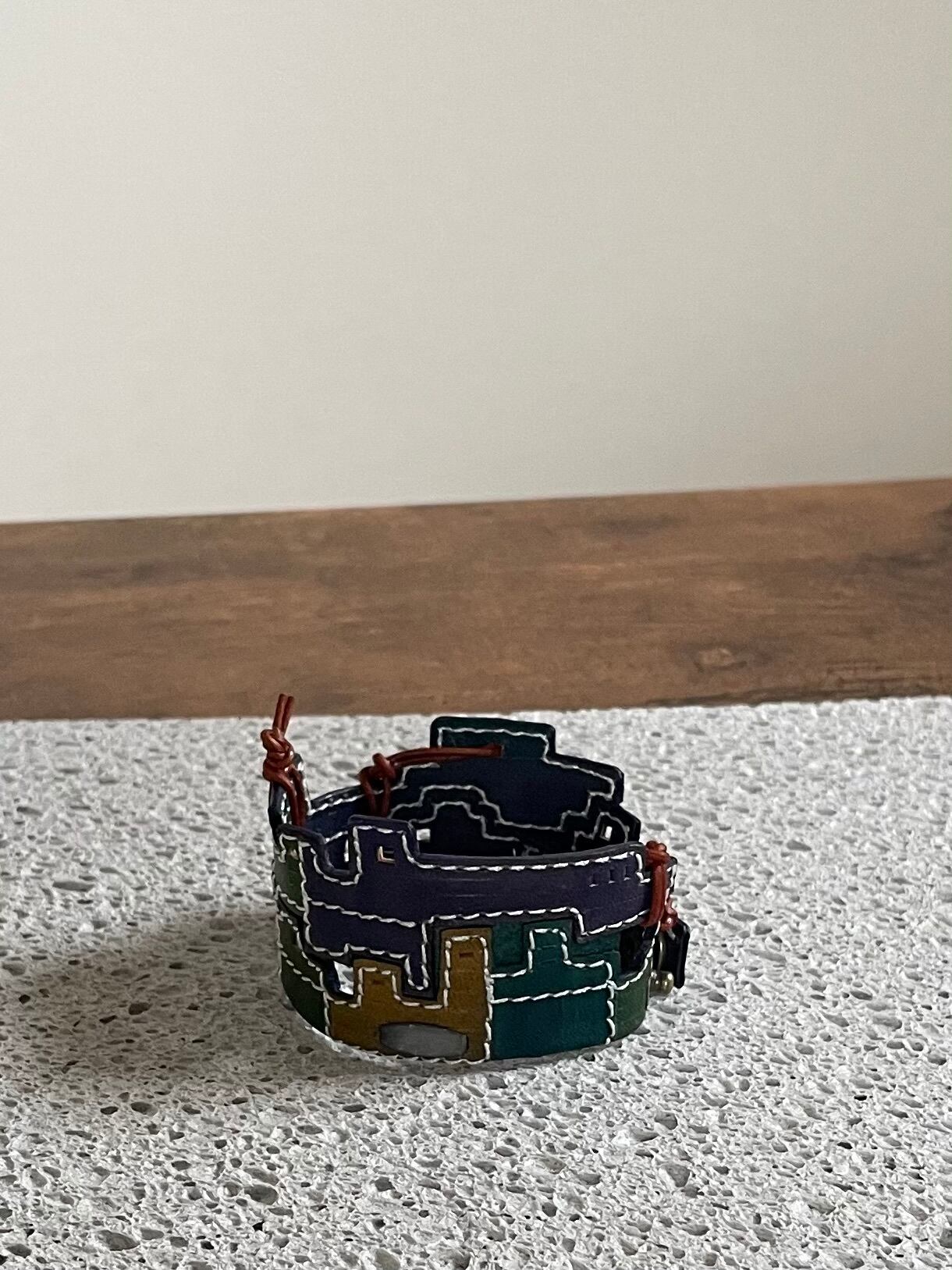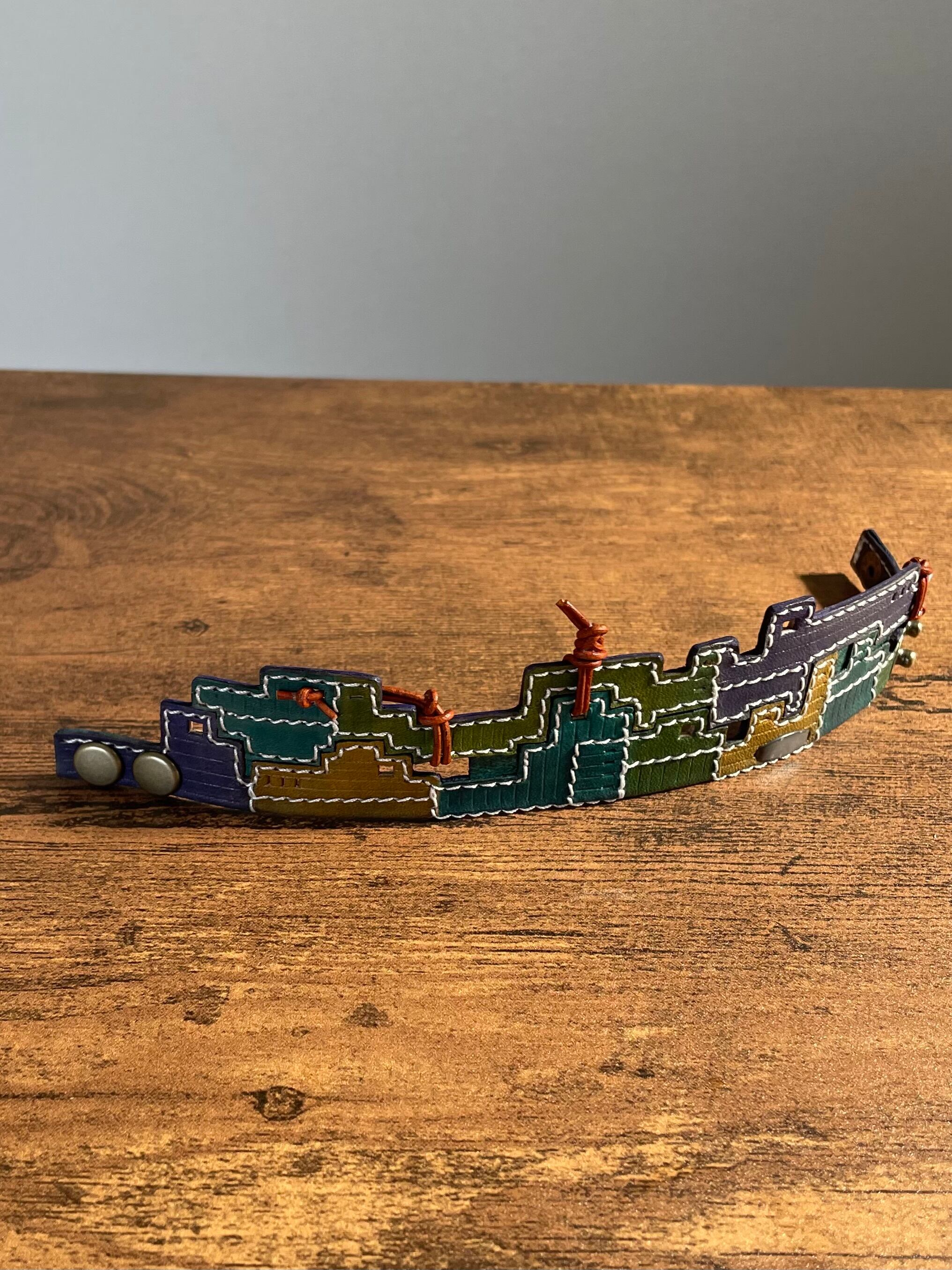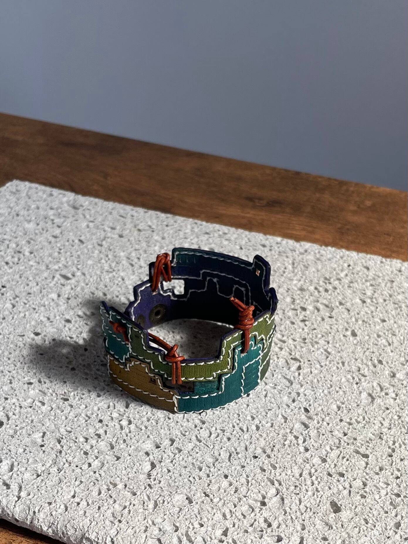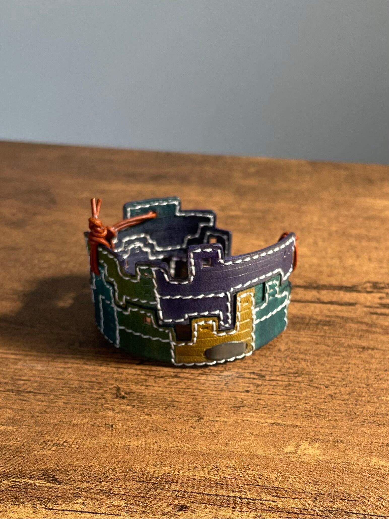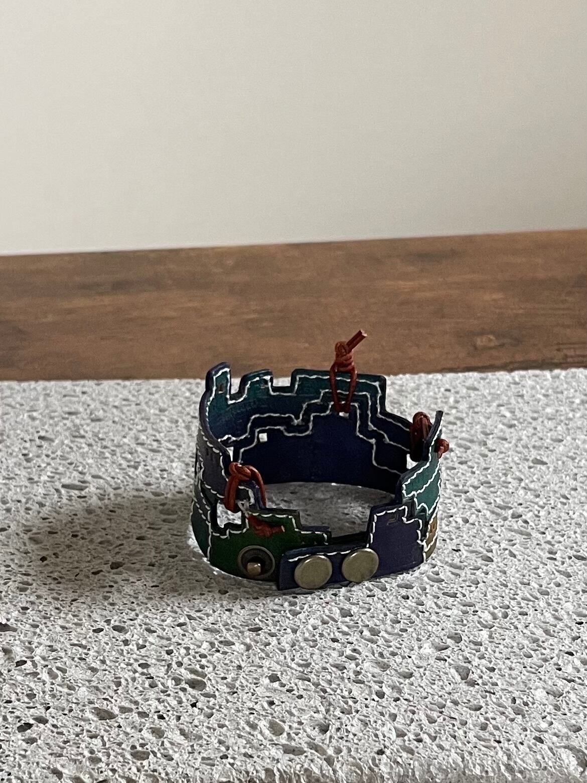 建物の配管や、えんとつ、配線がぐるぐると、入り組んでいる、とても個性的なレザーバングルを作りました。
