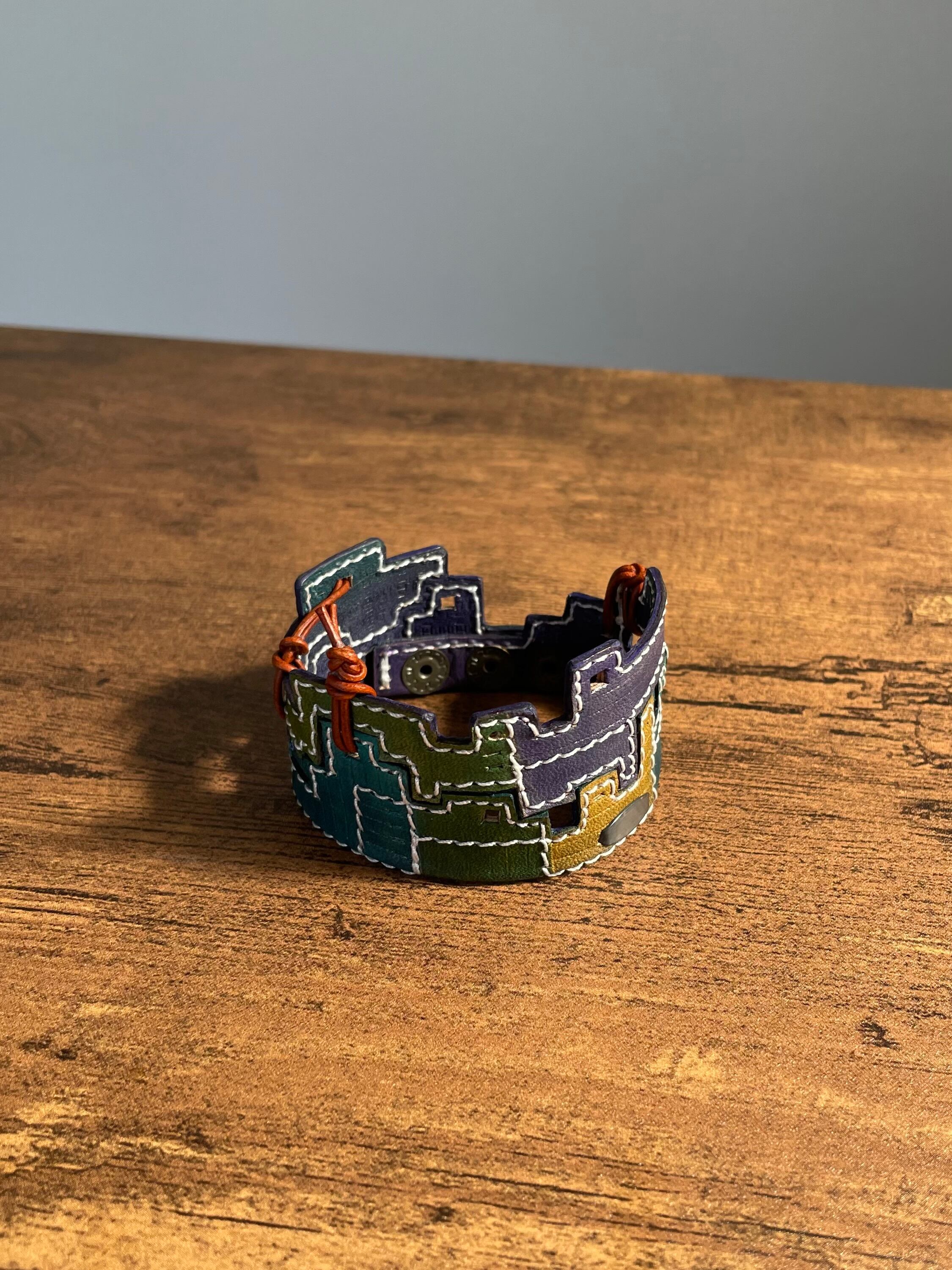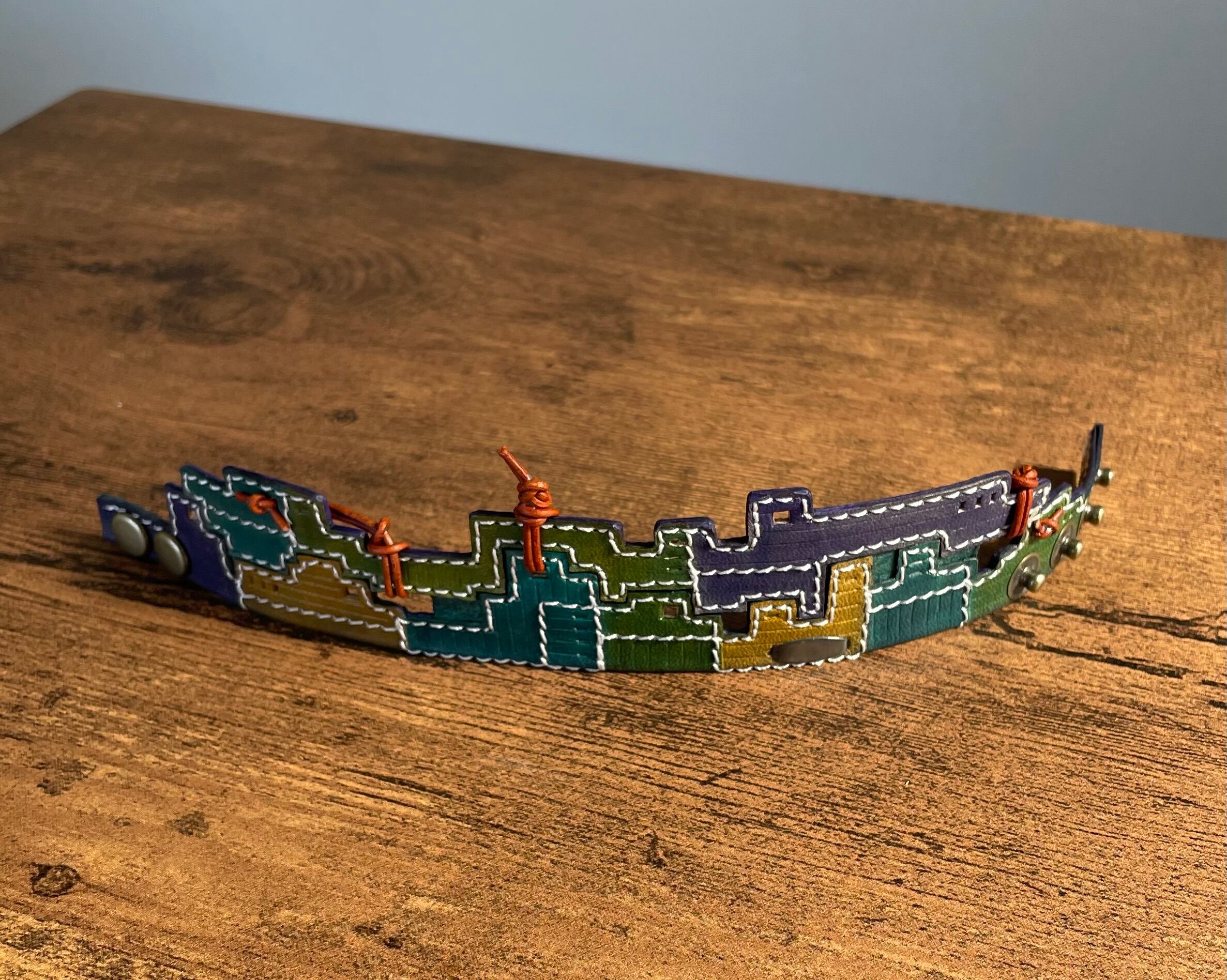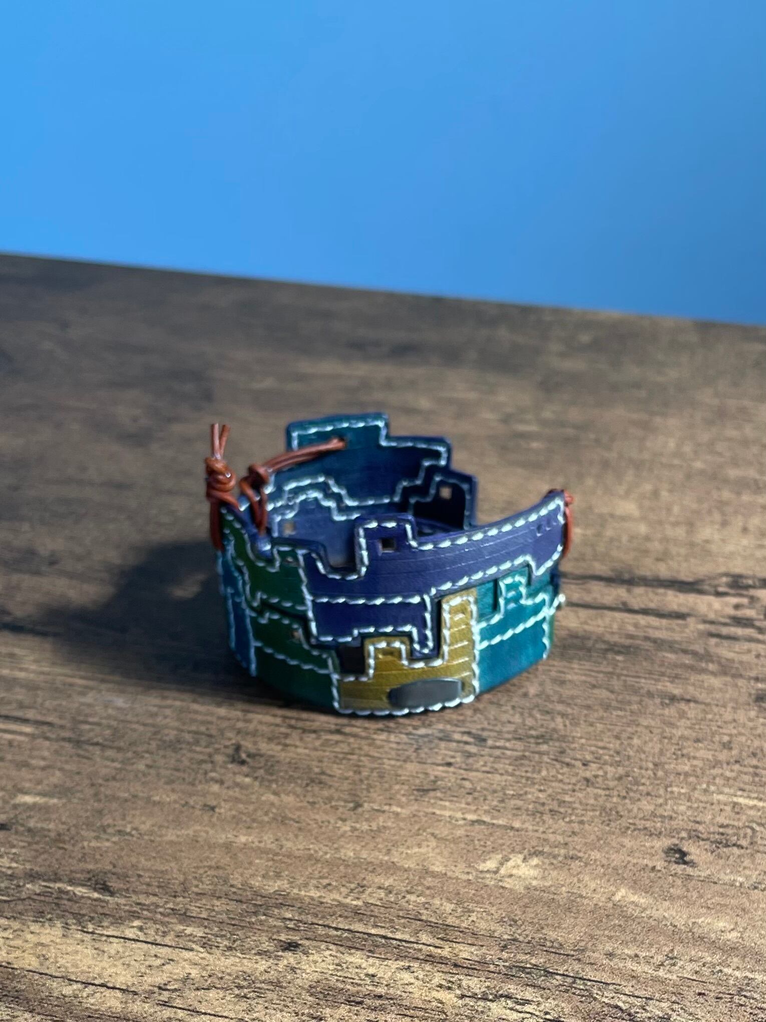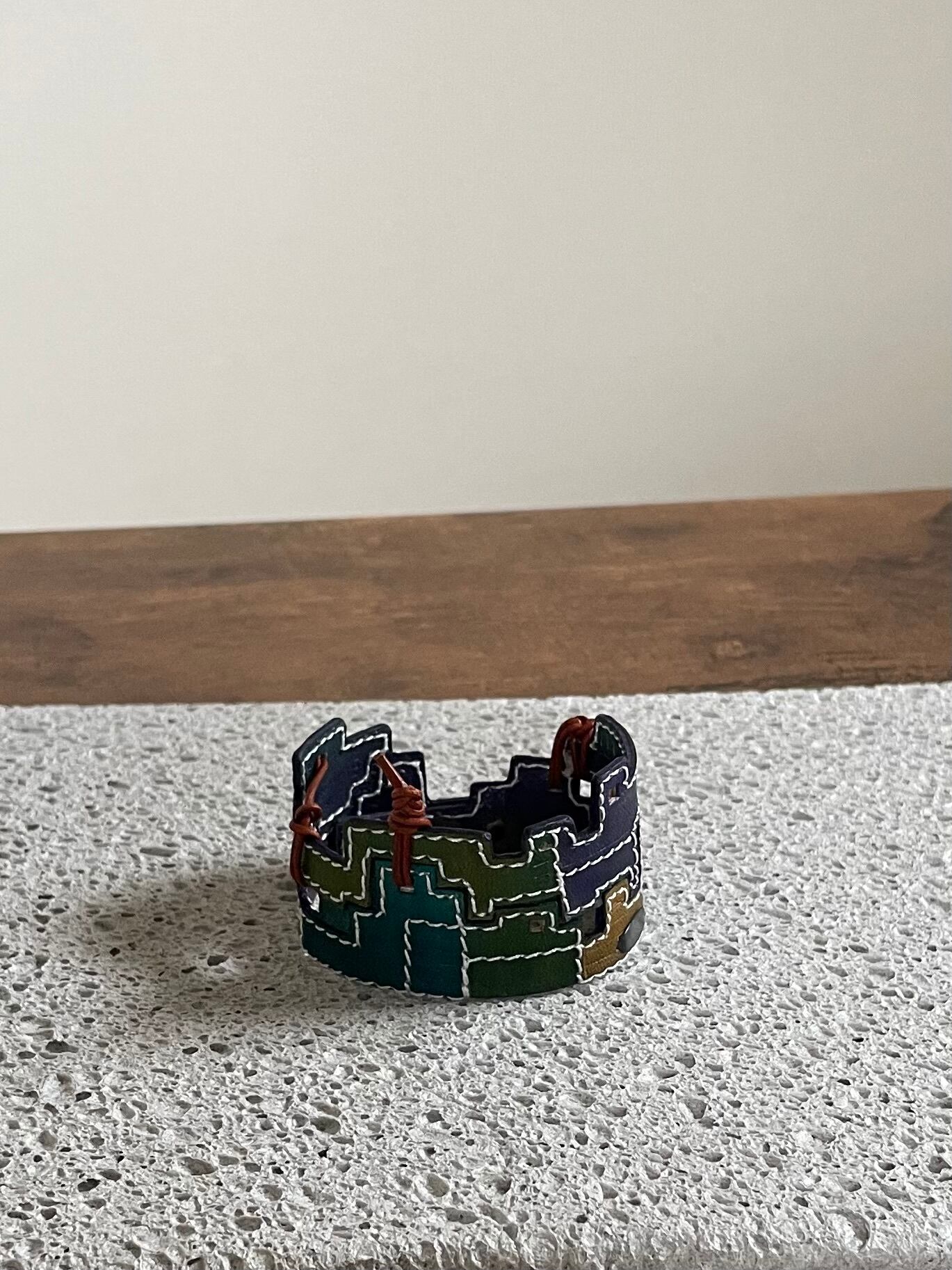 建物の配管や、えんとつ、配線がぐるぐると、入り組んでいる、とても個性的なレザーバングルを作りました。