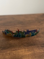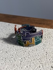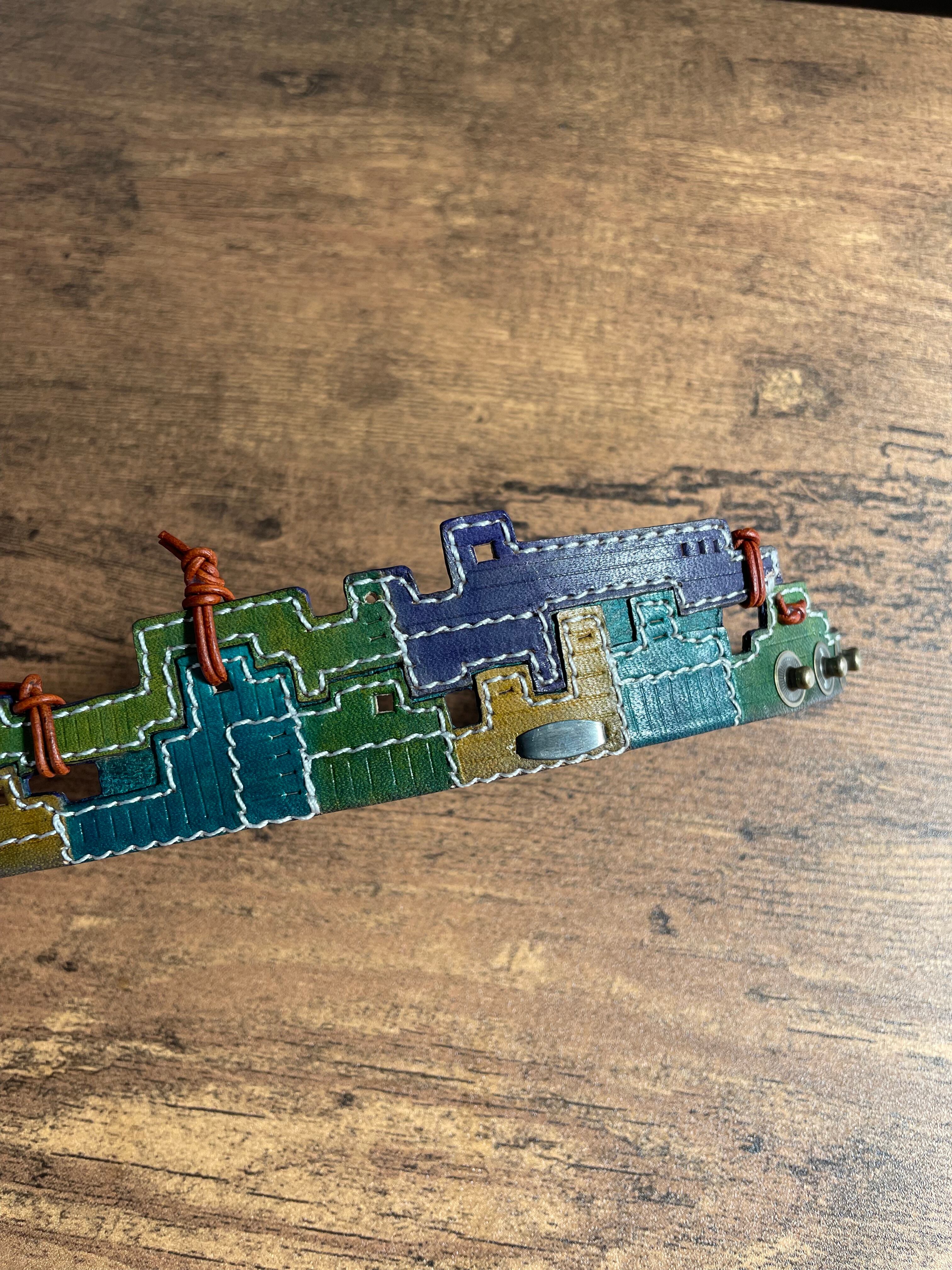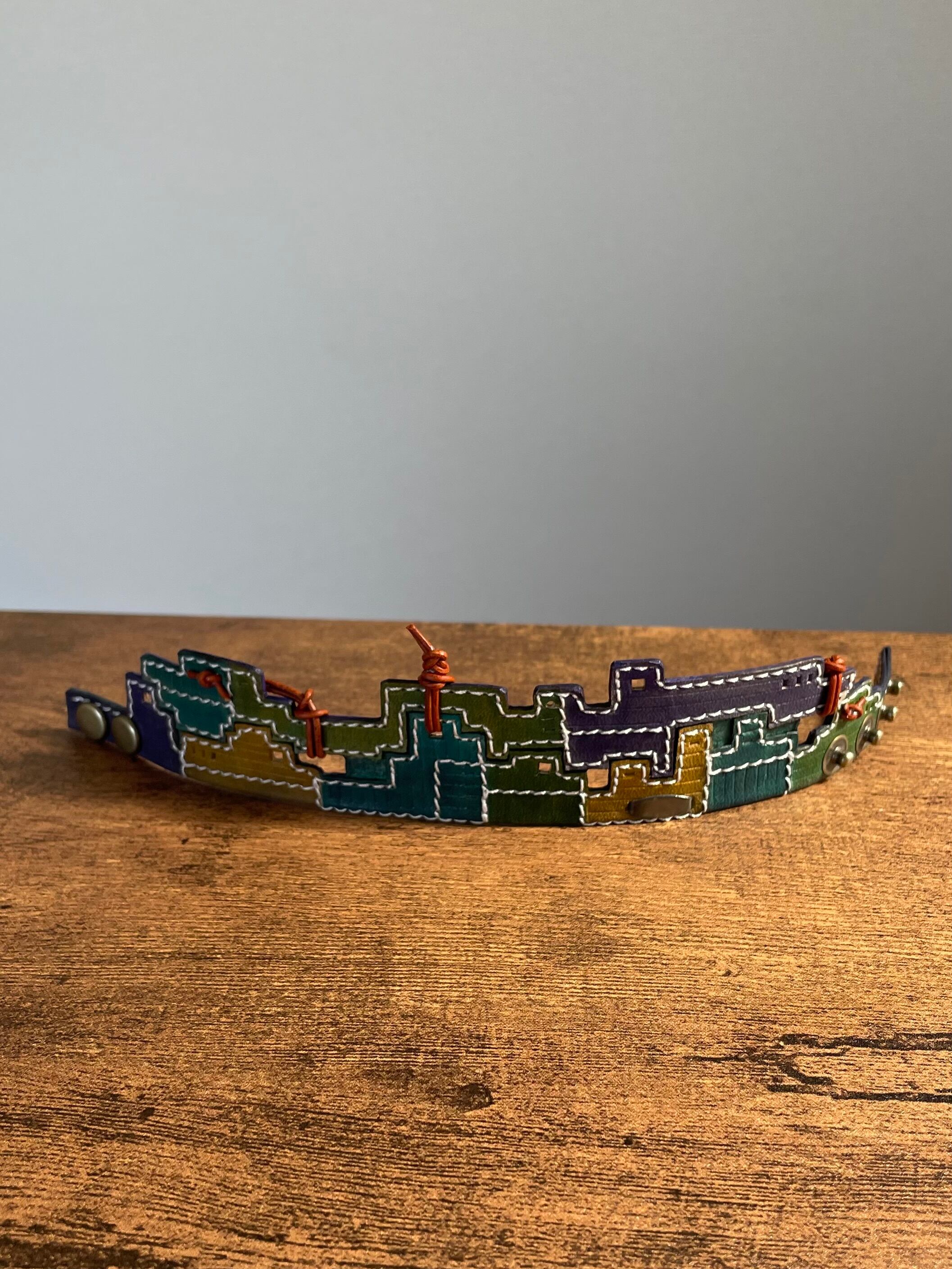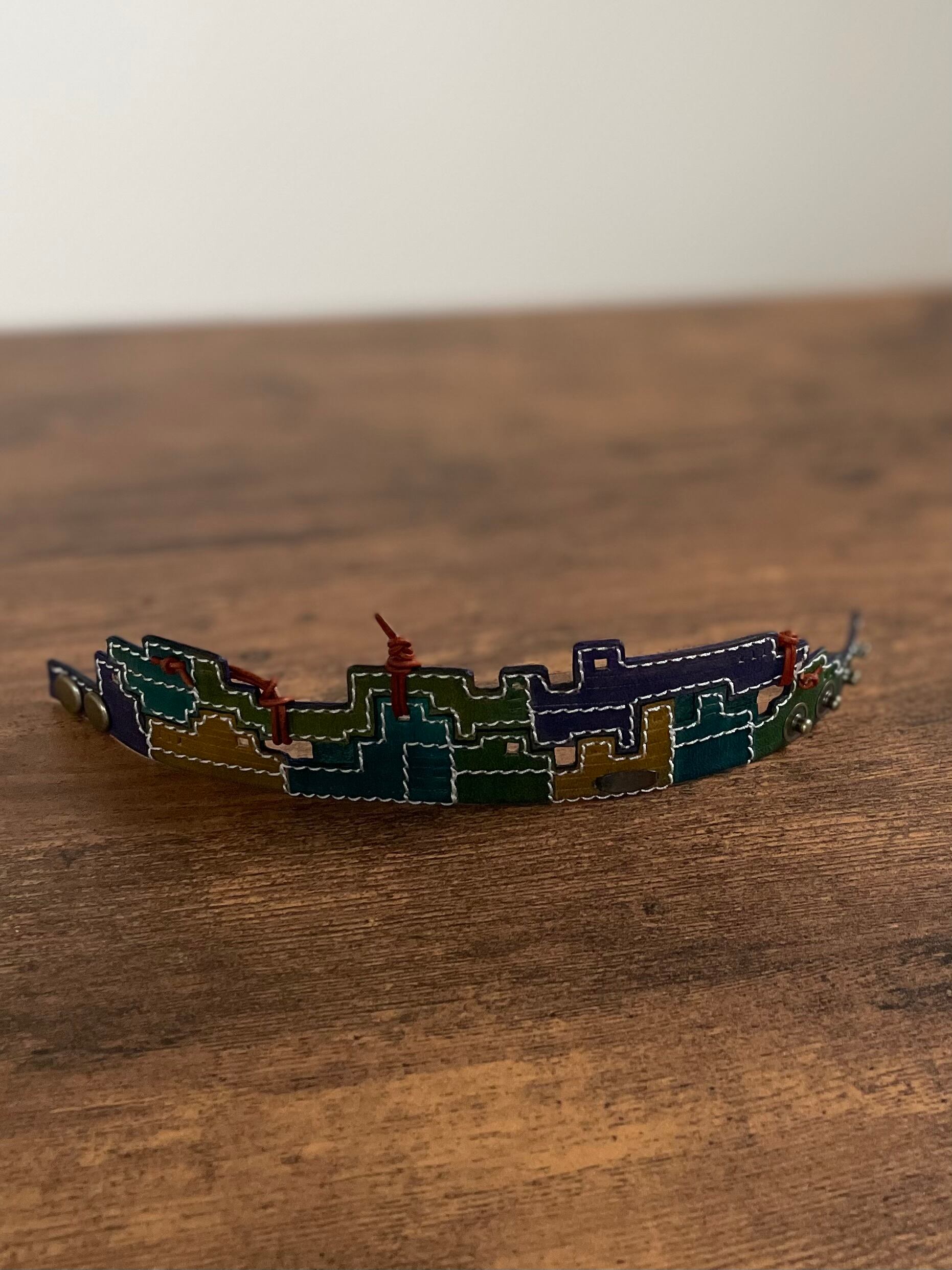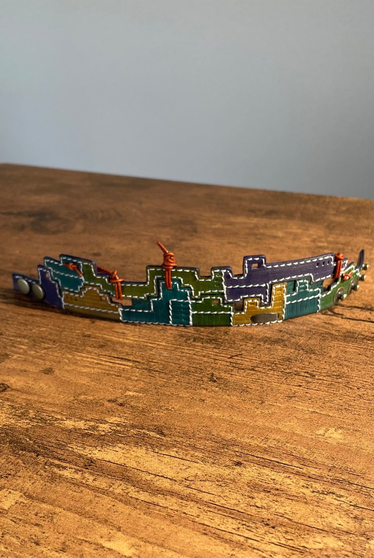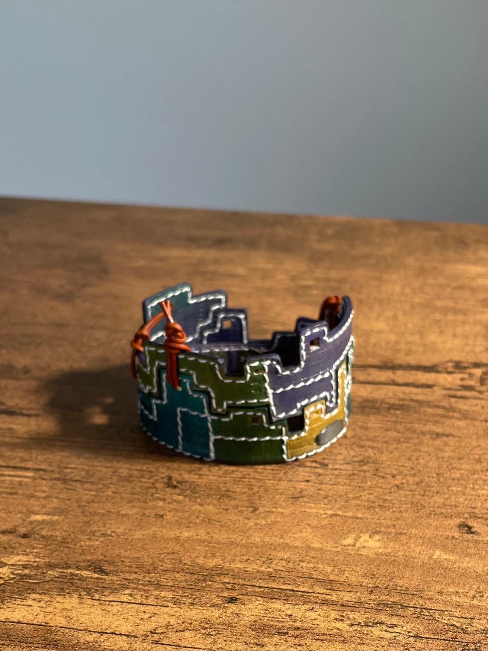 建物の配管や、えんとつ、配線がぐるぐると、入り組んでいる、とても個性的なレザーバングルを作りました。