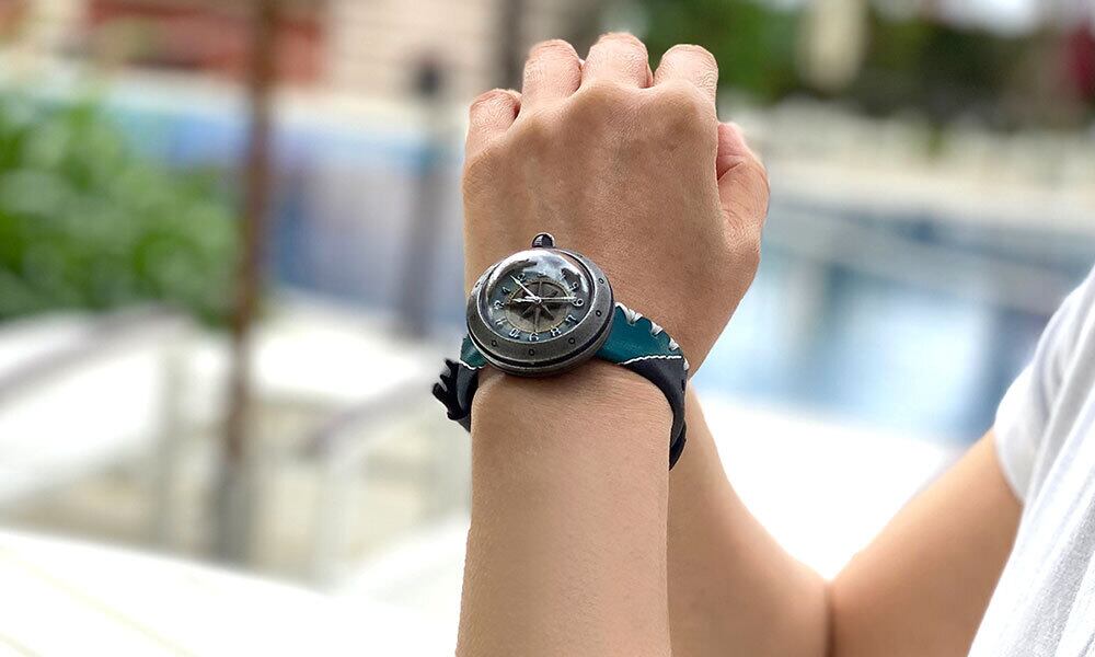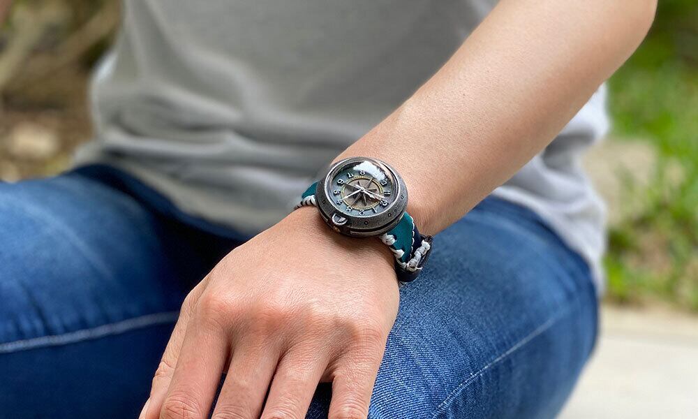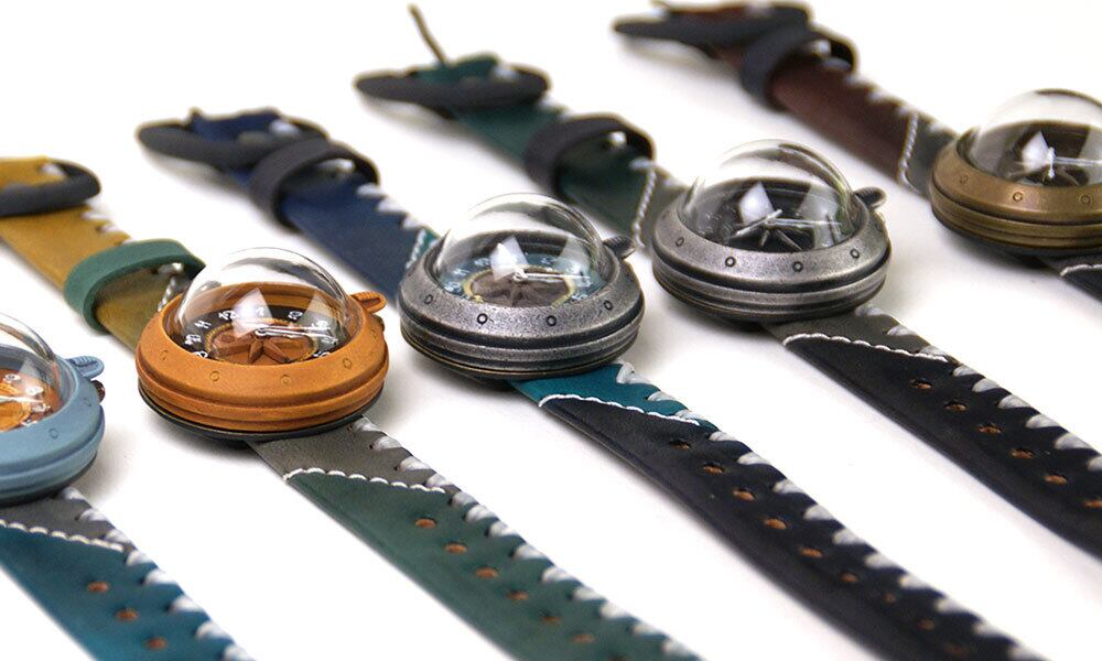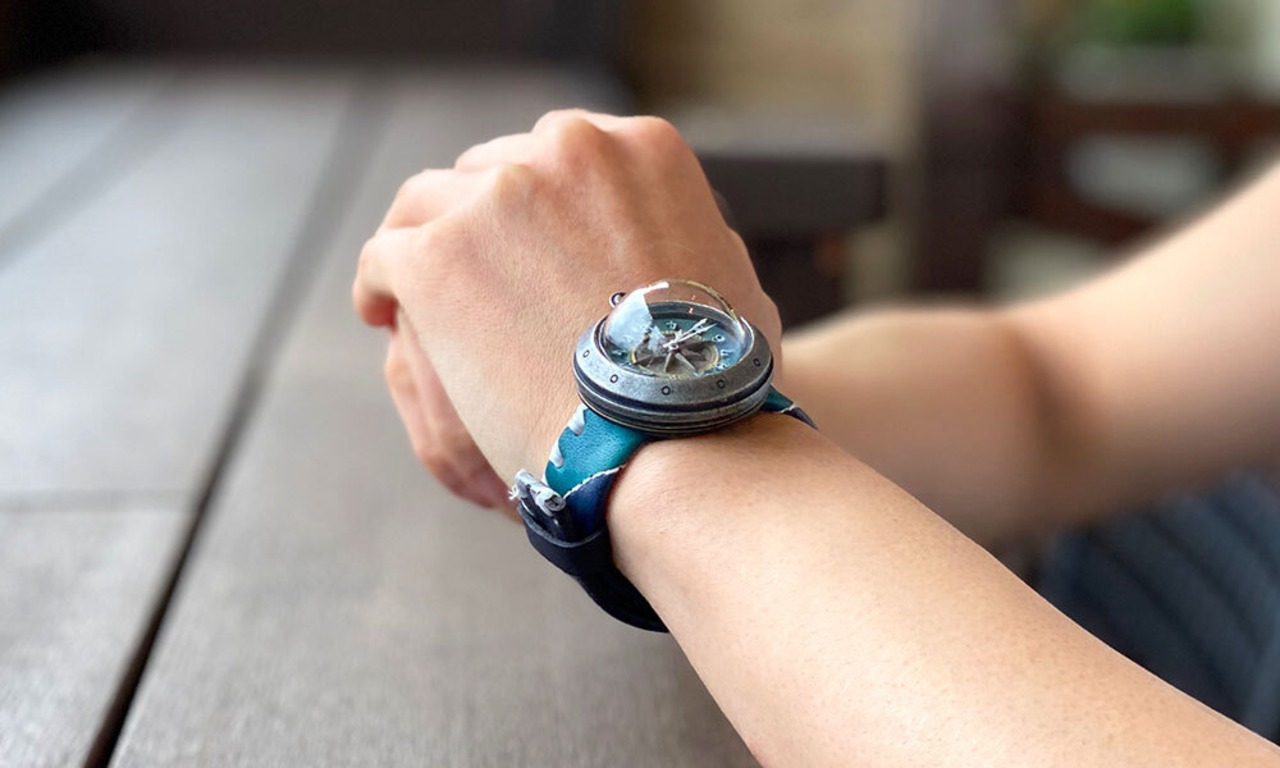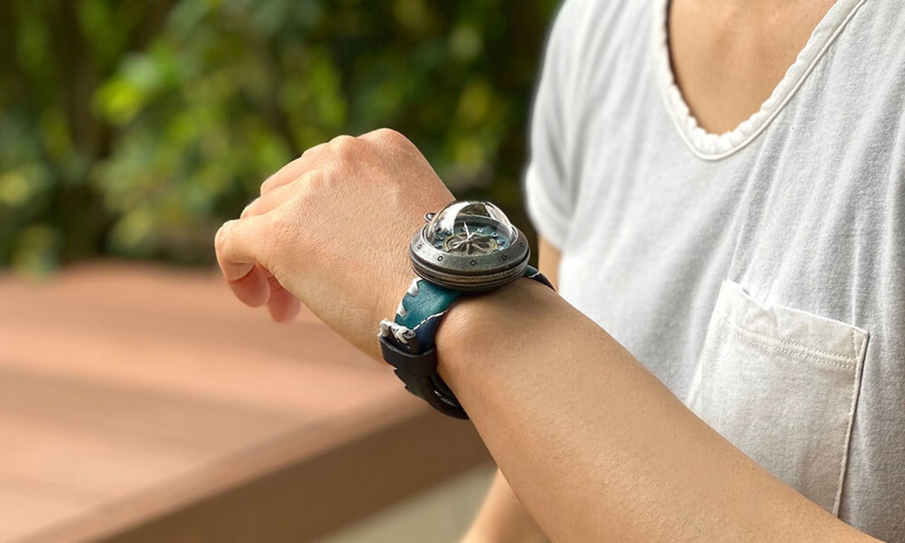 「半球レンズの時計と、コンパスをモチーフにした文字盤を合わせてほしい」というお客さんの声から生まれた時計です。