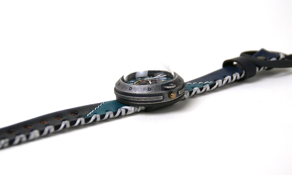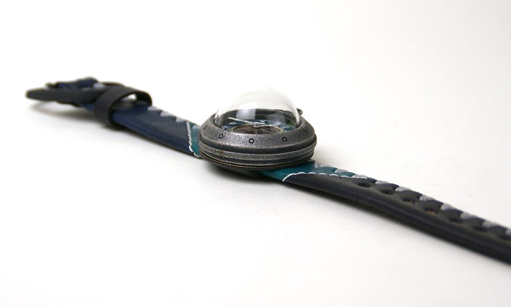 「時計本体」・・・船をイメージした時計本体には、ひとつひとつハンドメイドで制作した半球型のレンズがつき、ドーム型になっています。時計本体は、深みのある、ざらついたようなアンティークシルバーに仕上げました。