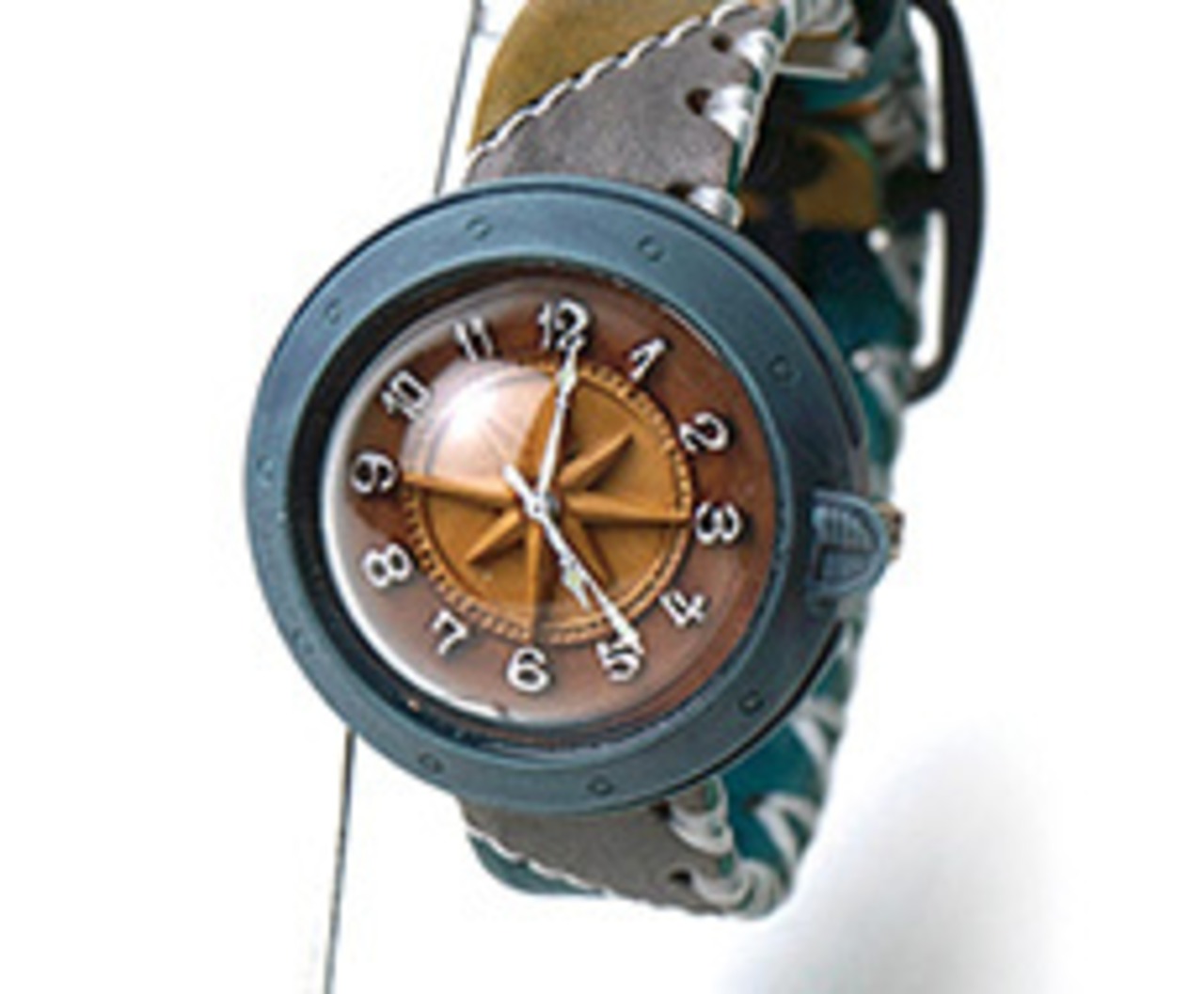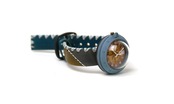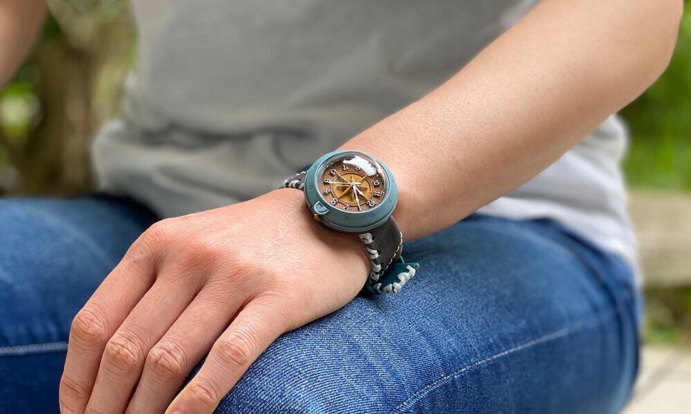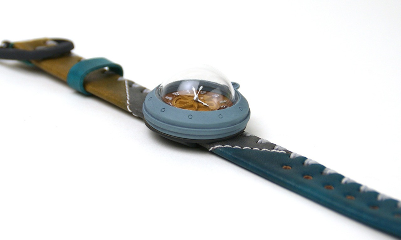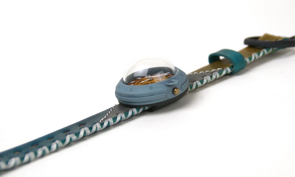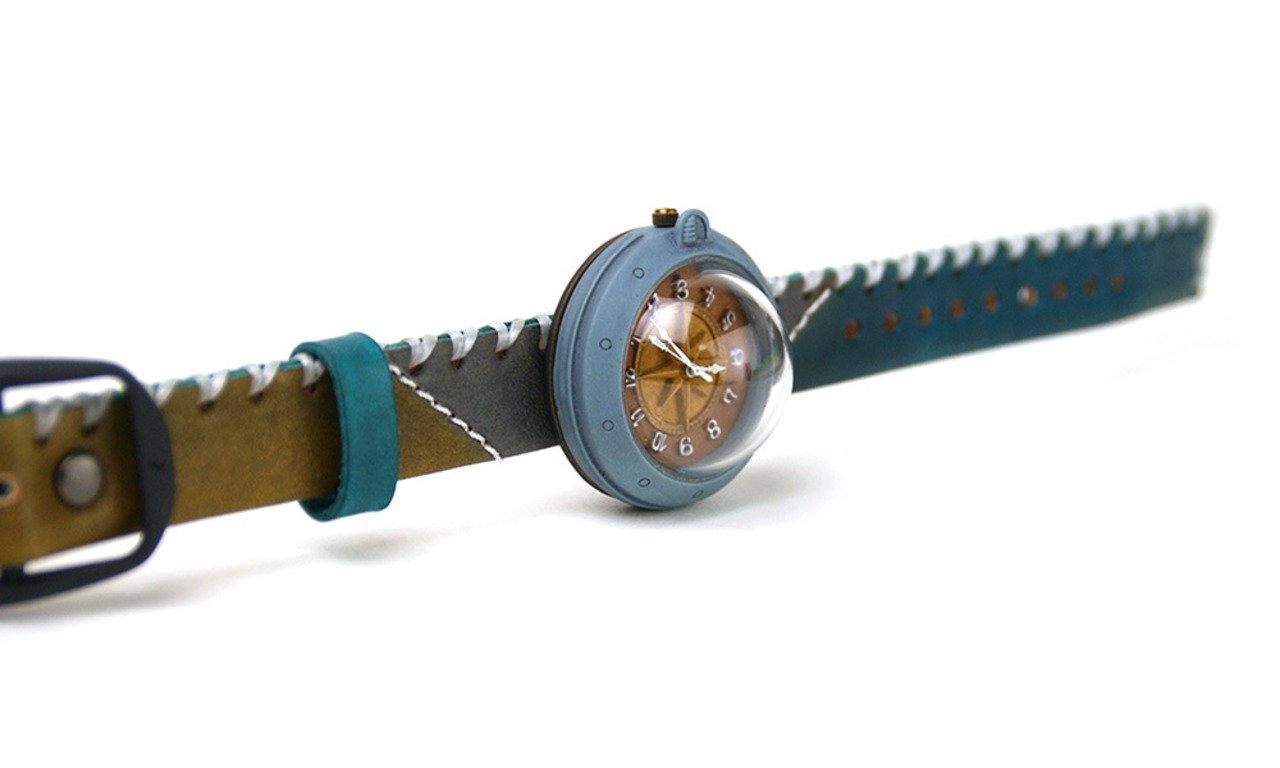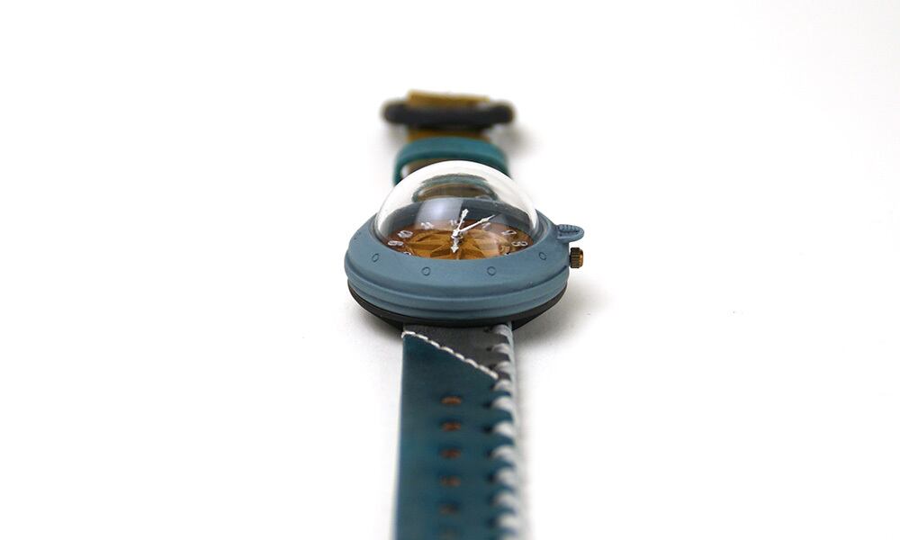 「時計本体」・・・船をイメージした時計本体には、ひとつひとつハンドメイドで制作した半球型のレンズがつき、ドーム型になっています。青色を少し汚したような味のあるカラーに仕上げました。