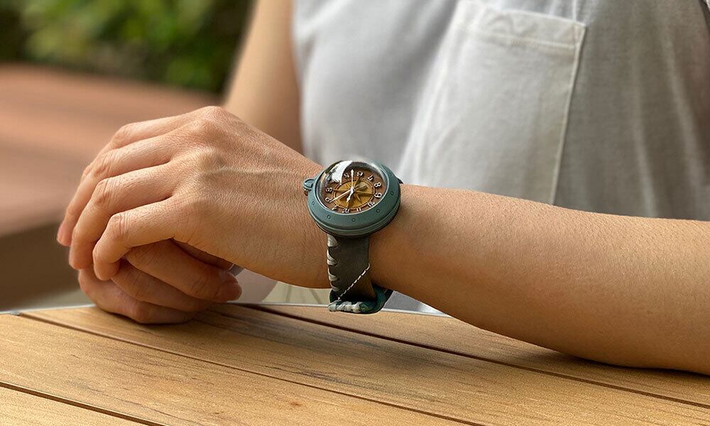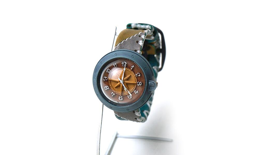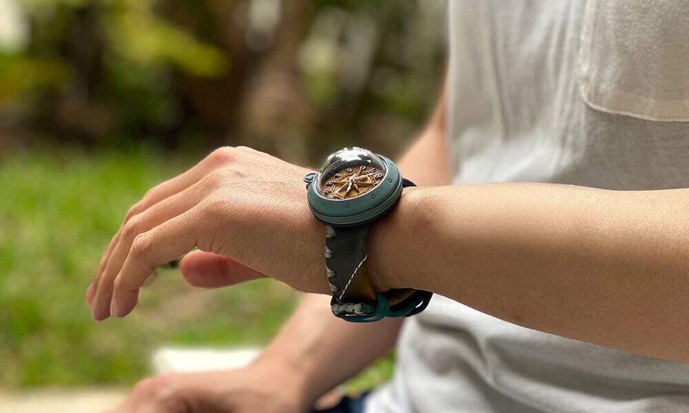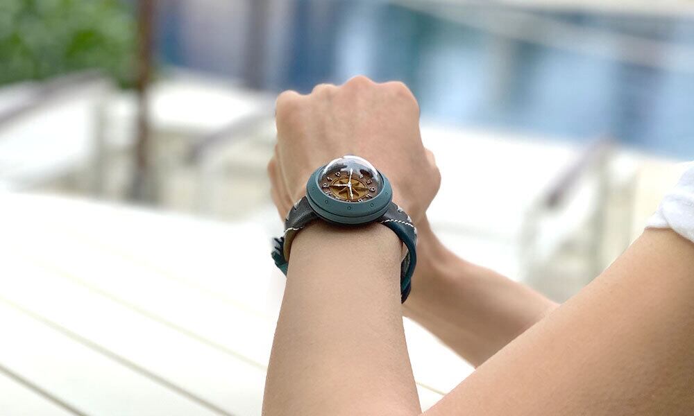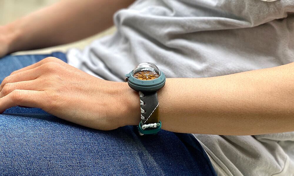 「半球レンズの時計と、コンパスをモチーフにした文字盤を合わせてほしい」というお客さんの声から生まれた時計です。