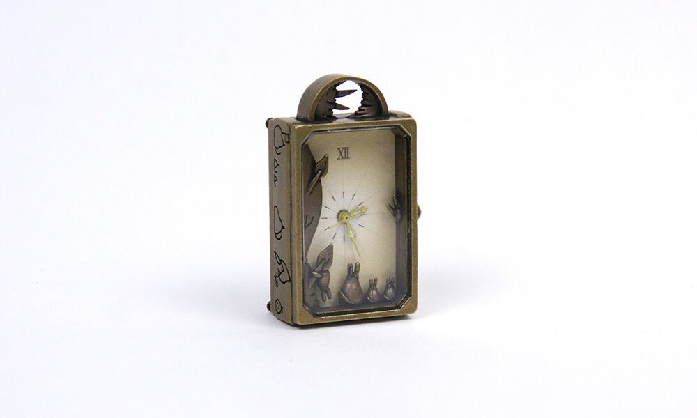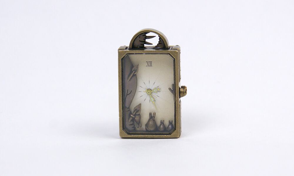 光の角度により、彼らの姿が刻々と文字盤に影を落とすような、そんな影絵仕立ての時計です。
