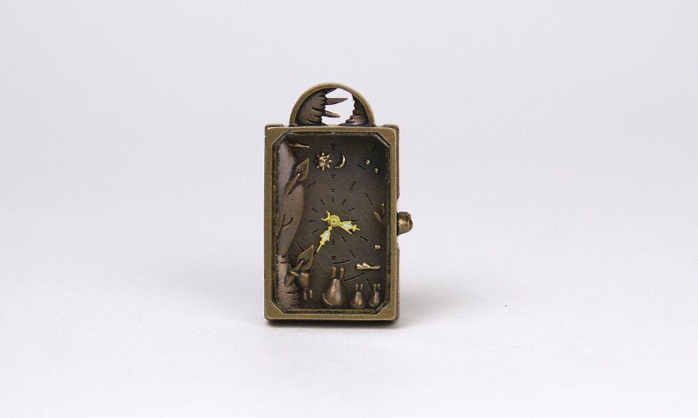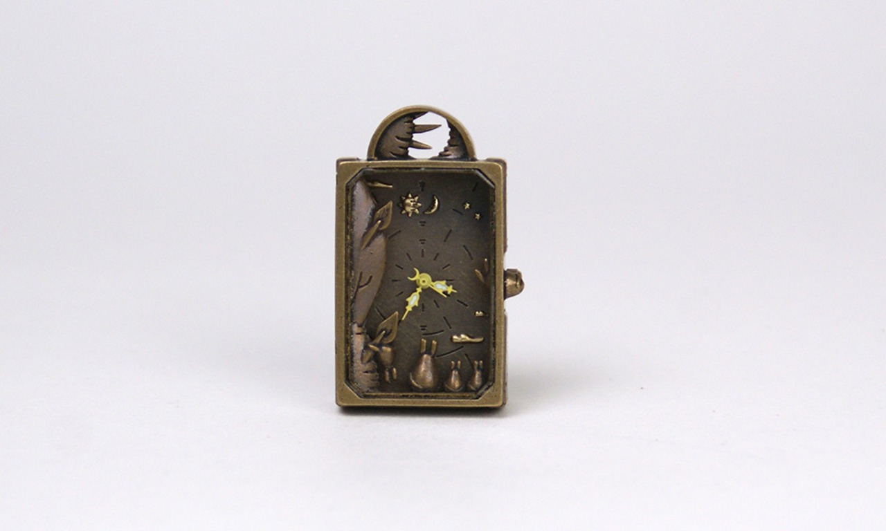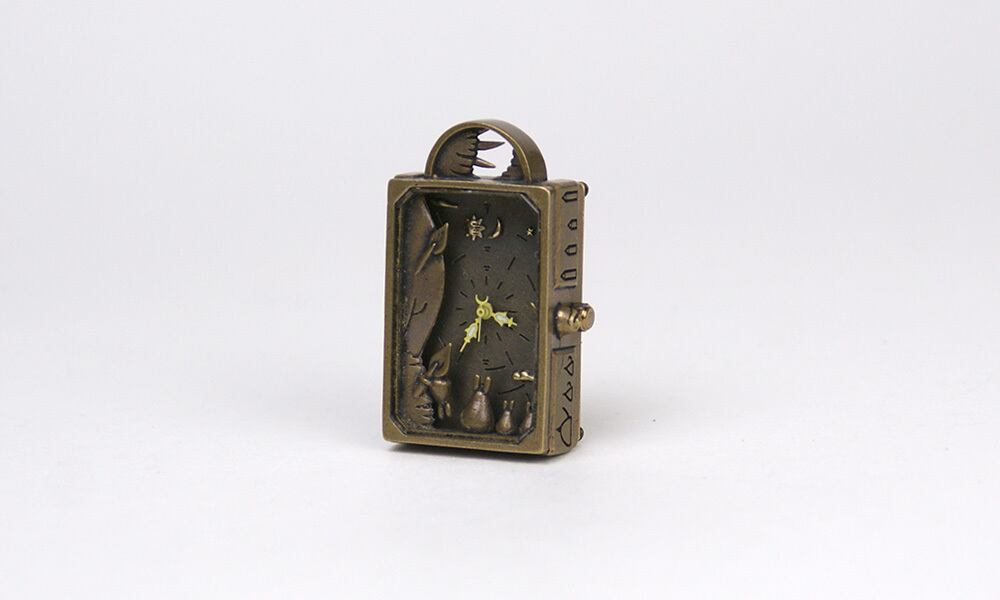 時計の中には、木陰から、動物たちがトキのはざまを今か今かと監視している様子が見えます。