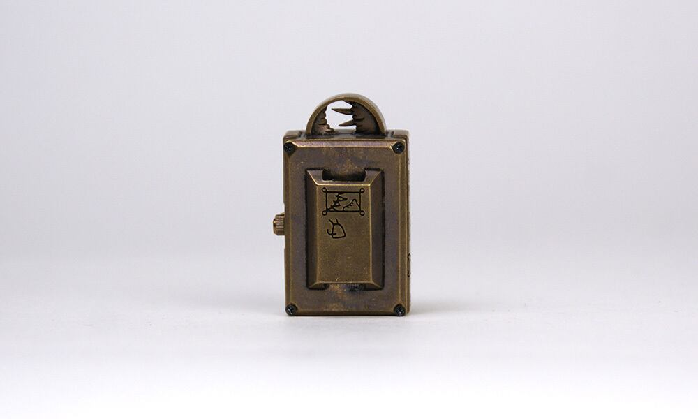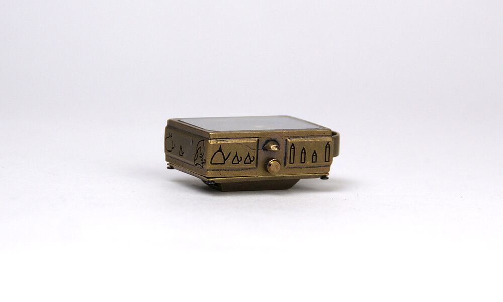 時計本体の上には太陽と月が、側面には持ち物などの壁画が描かれています。