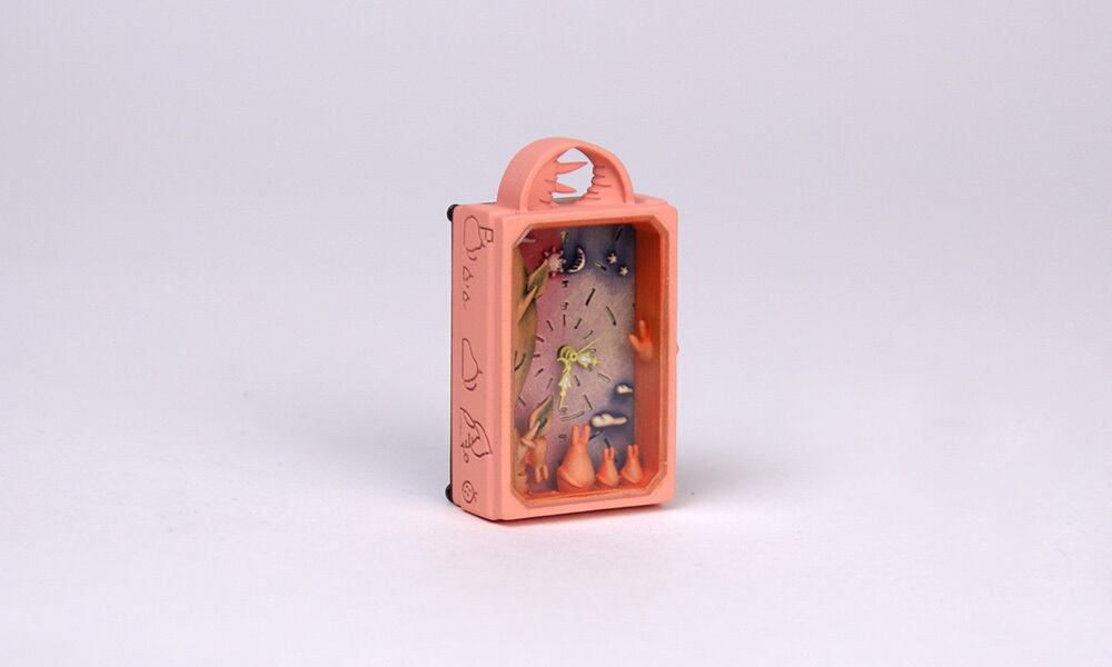 時計本体の上には太陽と月が、側面には持ち物などの壁画が描かれています。