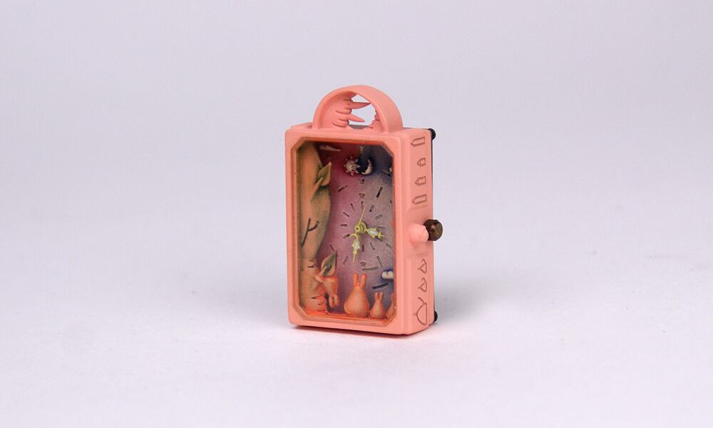 時計の中には、木陰から、動物たちがトキのはざまを今か今かと監視している様子が見えます。