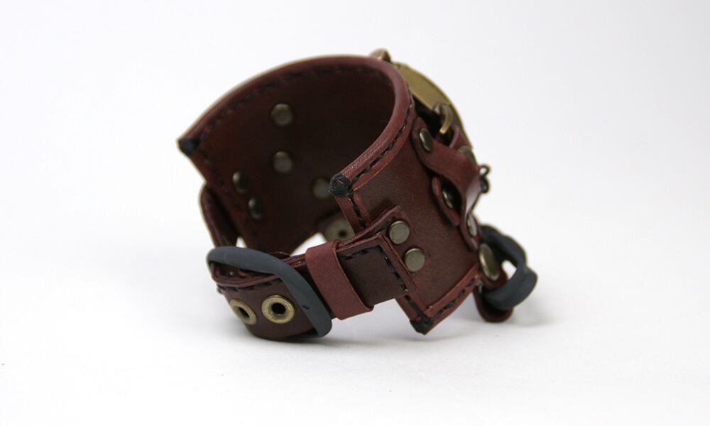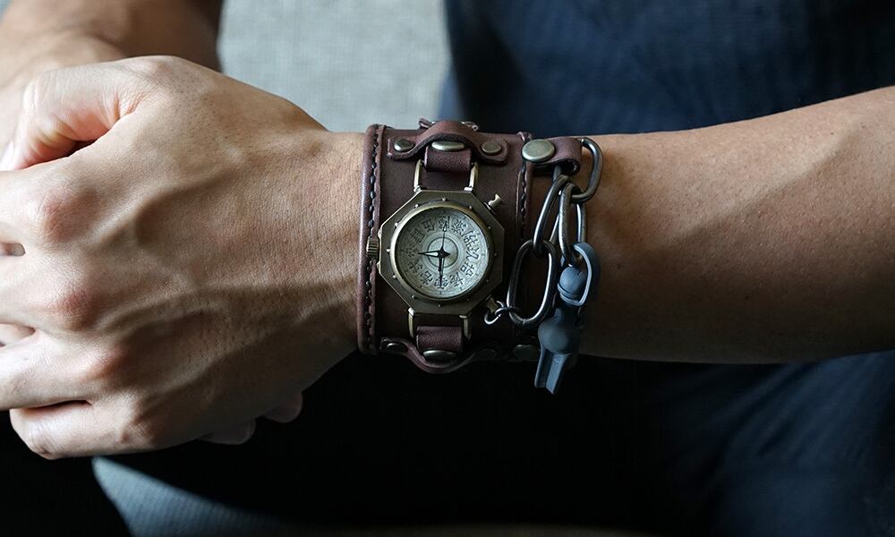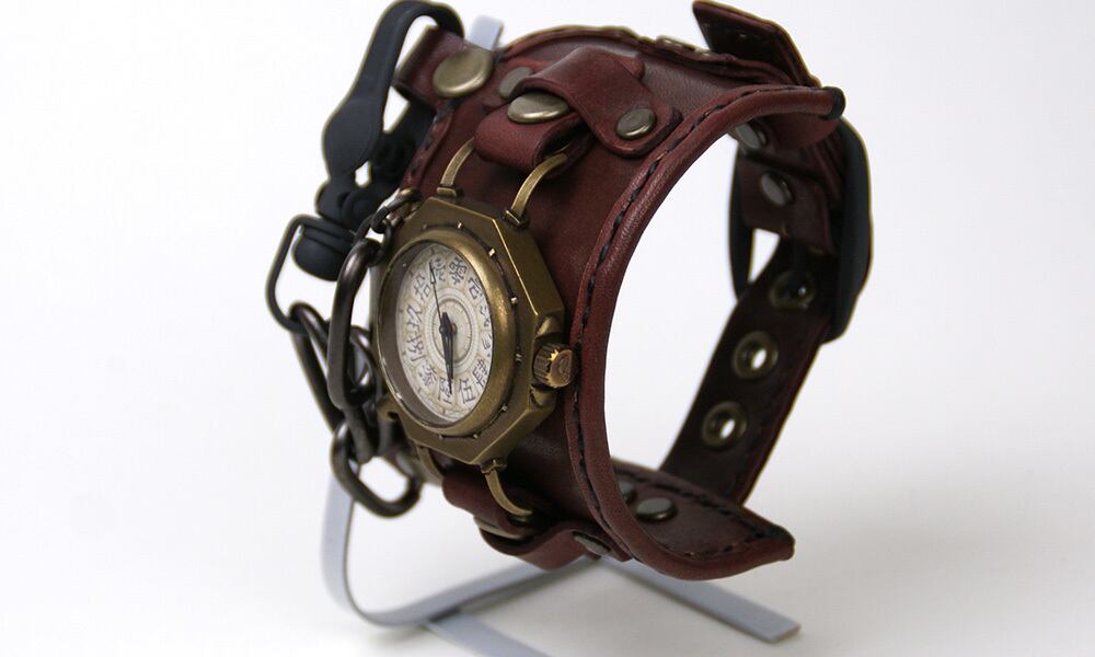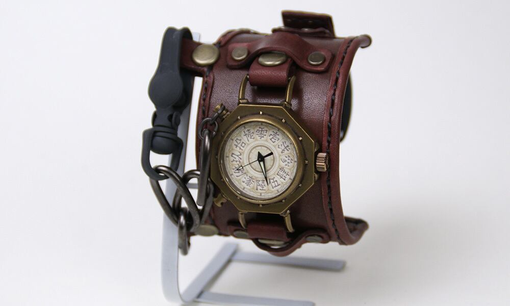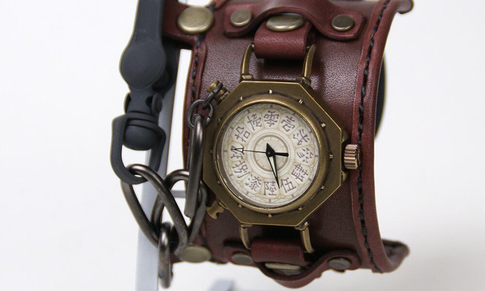 「時計本体」・・・金棒を模した八角形の本体に丸い窓がついた時計本体。それだけでなく、各パーツにもこだわりが満載です。例えば、時計の本体とベルトを繋ぐ部分は土台が八角形、そこから伸びる金具は四角形になっているなど、細かい部分もぜひご覧頂きたい時計です。そして、この時計は、時代を経たようなアンティーク風に仕上げています。