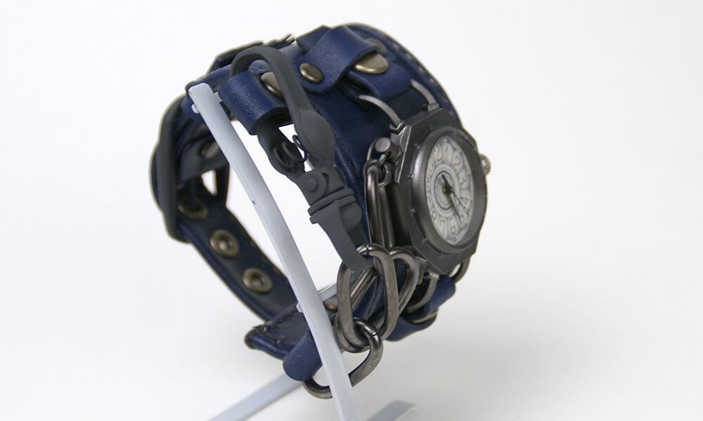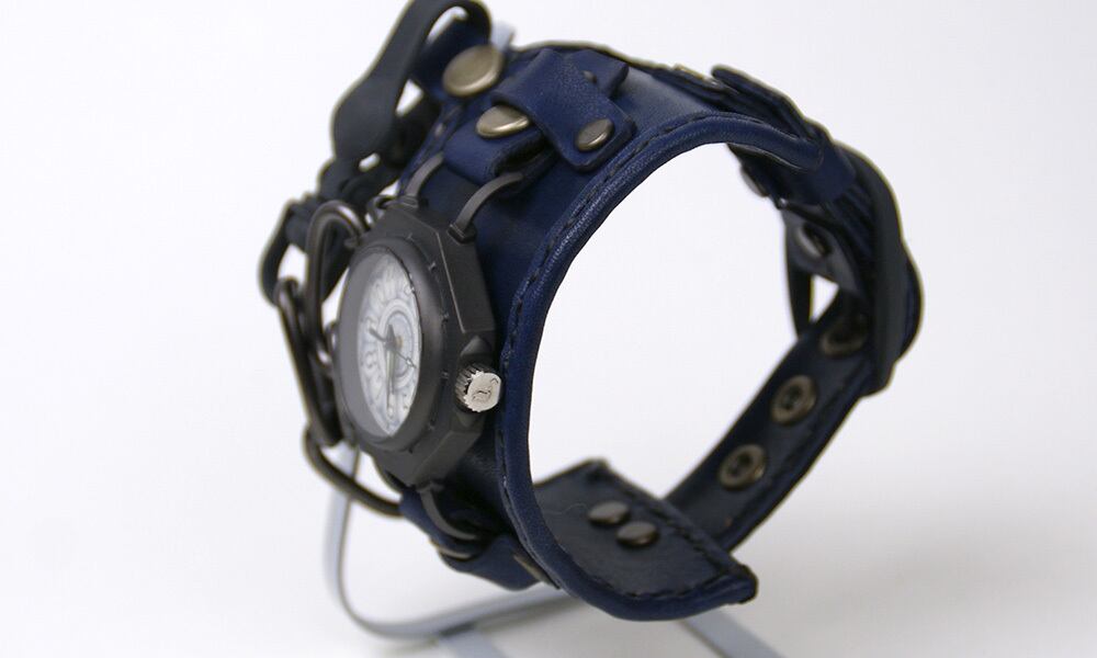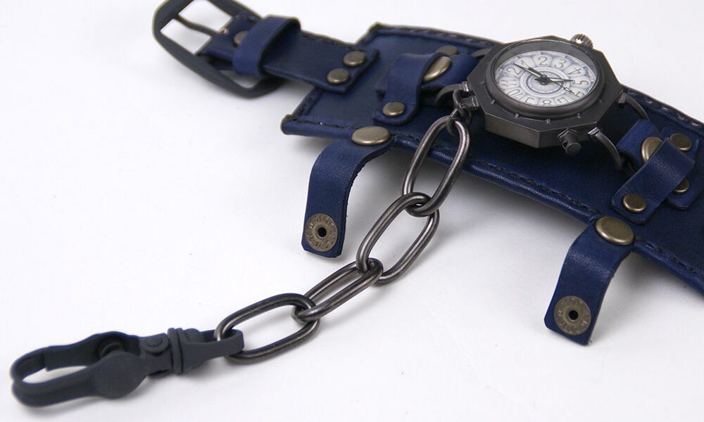 「時計本体」・・・金棒を模した八角形の本体に丸い窓がついた時計本体。それだけでなく、各パーツにもこだわりが満載です。例えば、時計の本体とベルトを繋ぐ部分は土台が八角形、そこから伸びる金具は四角形になっているなど、細かい部分もぜひご覧頂きたい時計です。そして、この時計は、時代を経たようなアンティーク風に仕上げています。