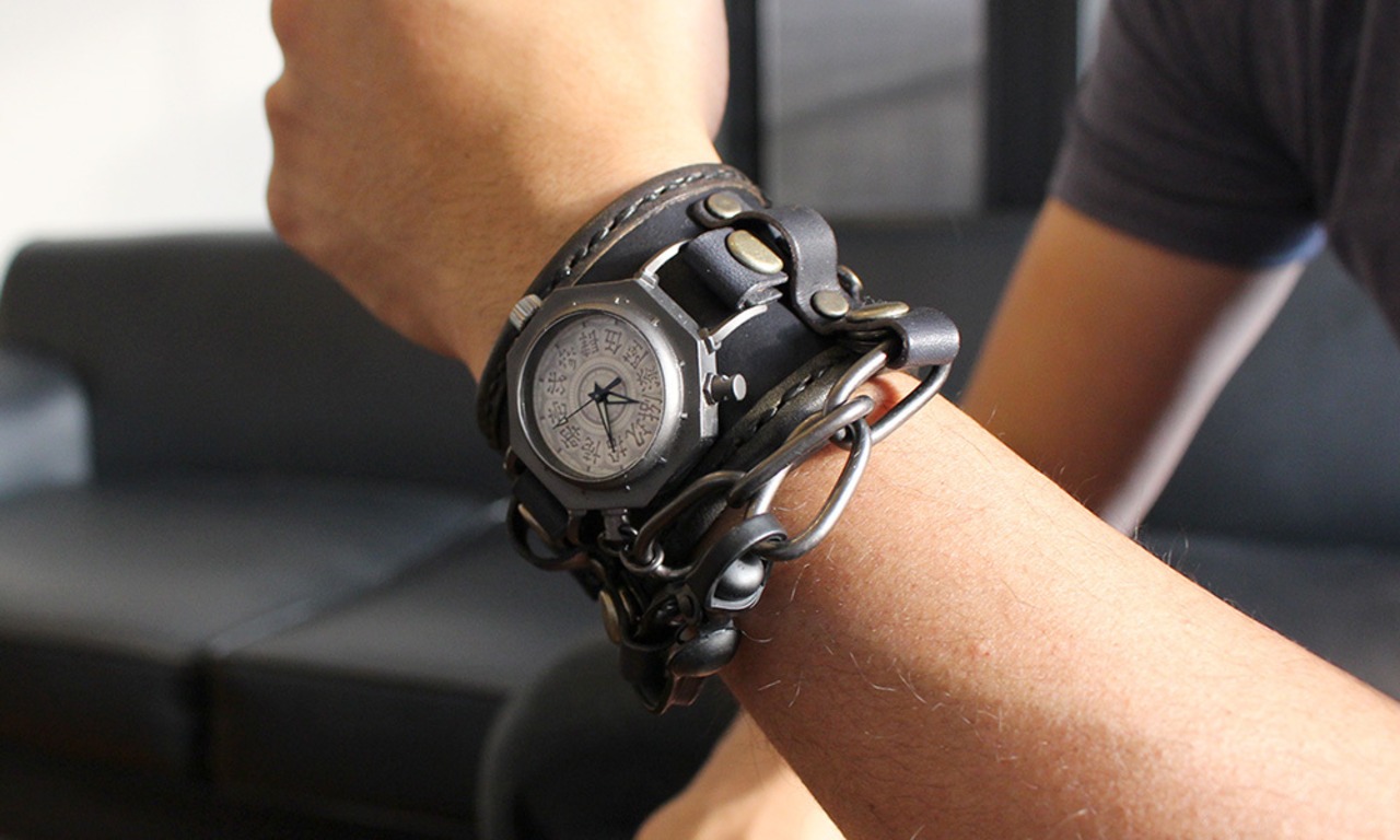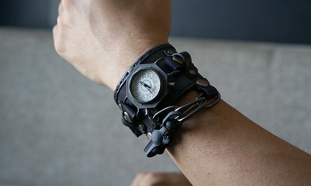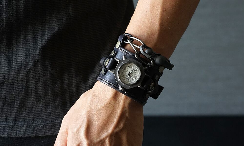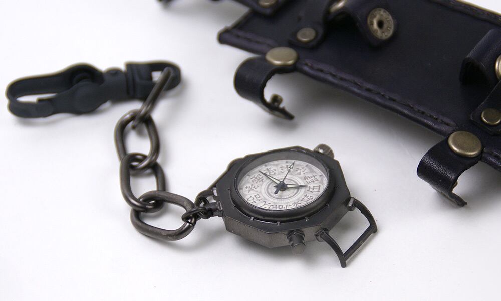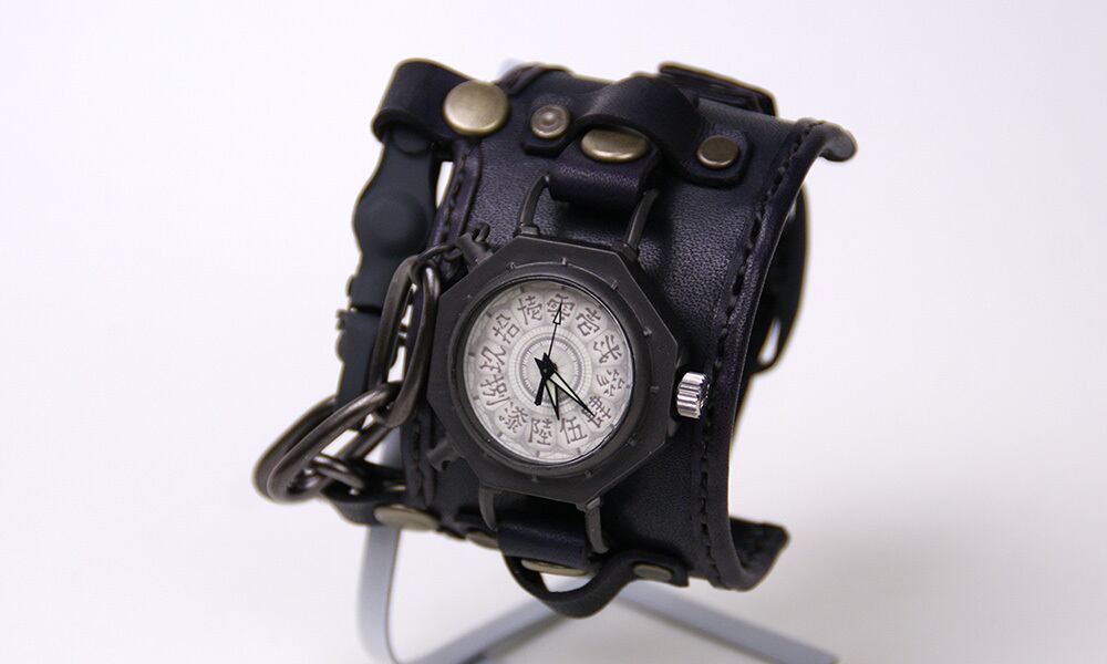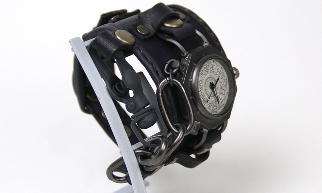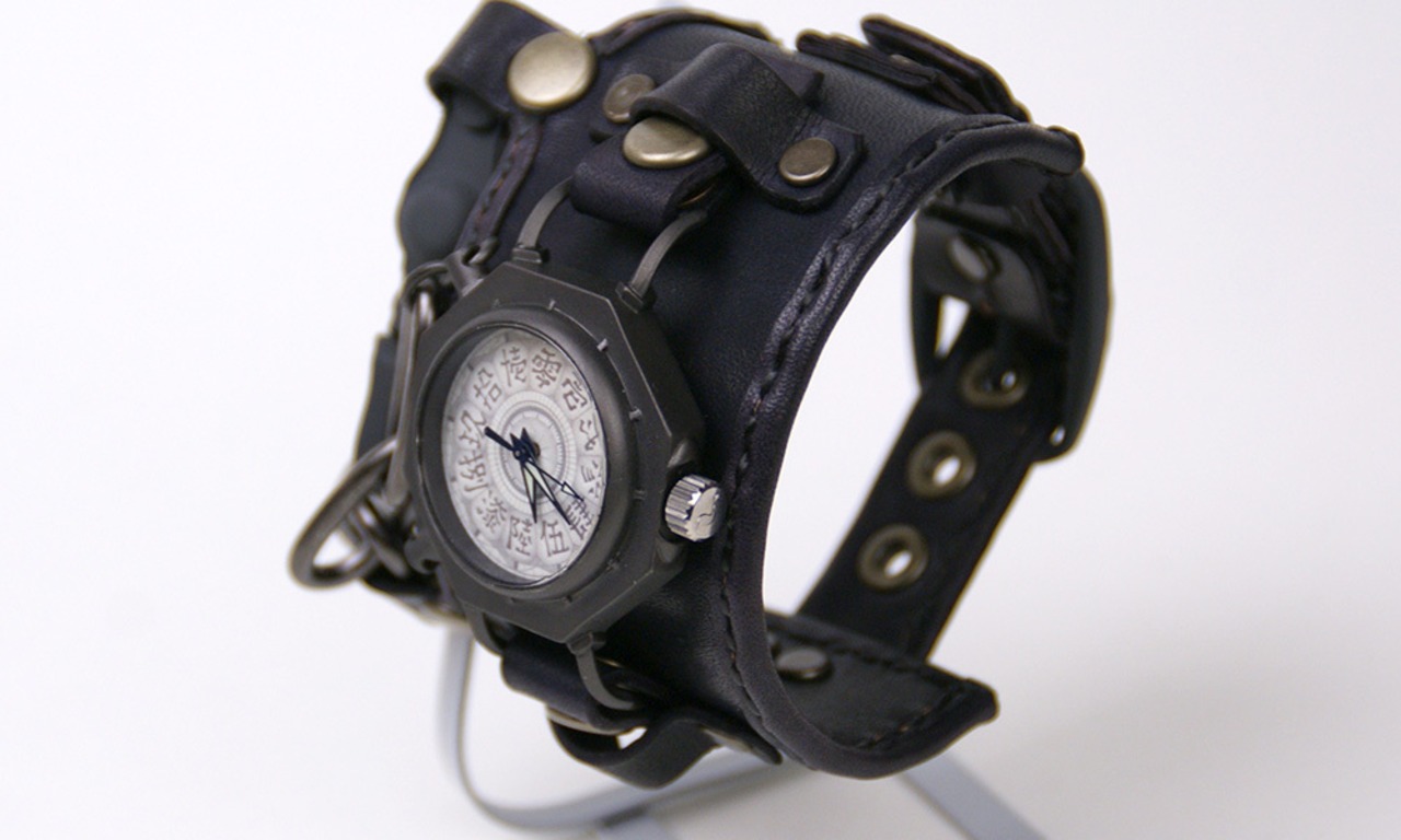 「時計本体」・・・金棒を模した八角形の本体に丸い窓がついた時計本体。それだけでなく、各パーツにもこだわりが満載です。例えば、時計の本体とベルトを繋ぐ部分は土台が八角形、そこから伸びる金具は四角形になっているなど、細かい部分もぜひご覧頂きたい時計です。そして、この時計は、時代を経たようなアンティーク風に仕上げています。