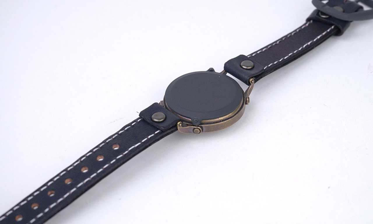 「時計本体」・・・Classicaシリーズ共通の直径約3.5センチの絶妙な大きさの時計本体は、本体と革をつなぐ部分に、勾玉をイメージしてデザインした金具をそっと配置しています。