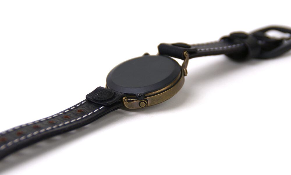 「時計本体」・・・直径約3.5センチの絶妙な大きさの時計本体は、本体と革をつなぐ部分に、勾玉をイメージしてデザインした金具をそっと配置しました。また、一見シンプルに見えながら、様々な形状のパーツを組み合わせてできています。