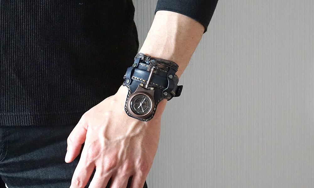 まるでアニメから出てきたようなデザインの時計とよくご意見を頂く、革のバングルタイプの腕時計。