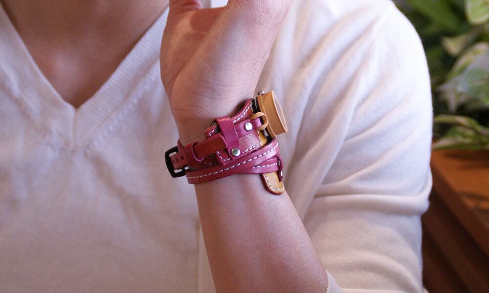バングルの巻き方ですが、グルグルと巻いていただいて、もし、革が余ったら巻いたところに適当に差し込んでください。