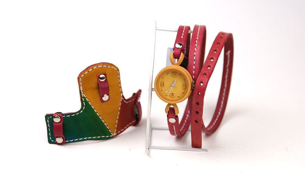 「カラフルな本革バングル」・・・各部位ごとに手塗りで色を入れ、さらに裏面などの塗りなどを工夫することで、この雰囲気を醸し出しています。
