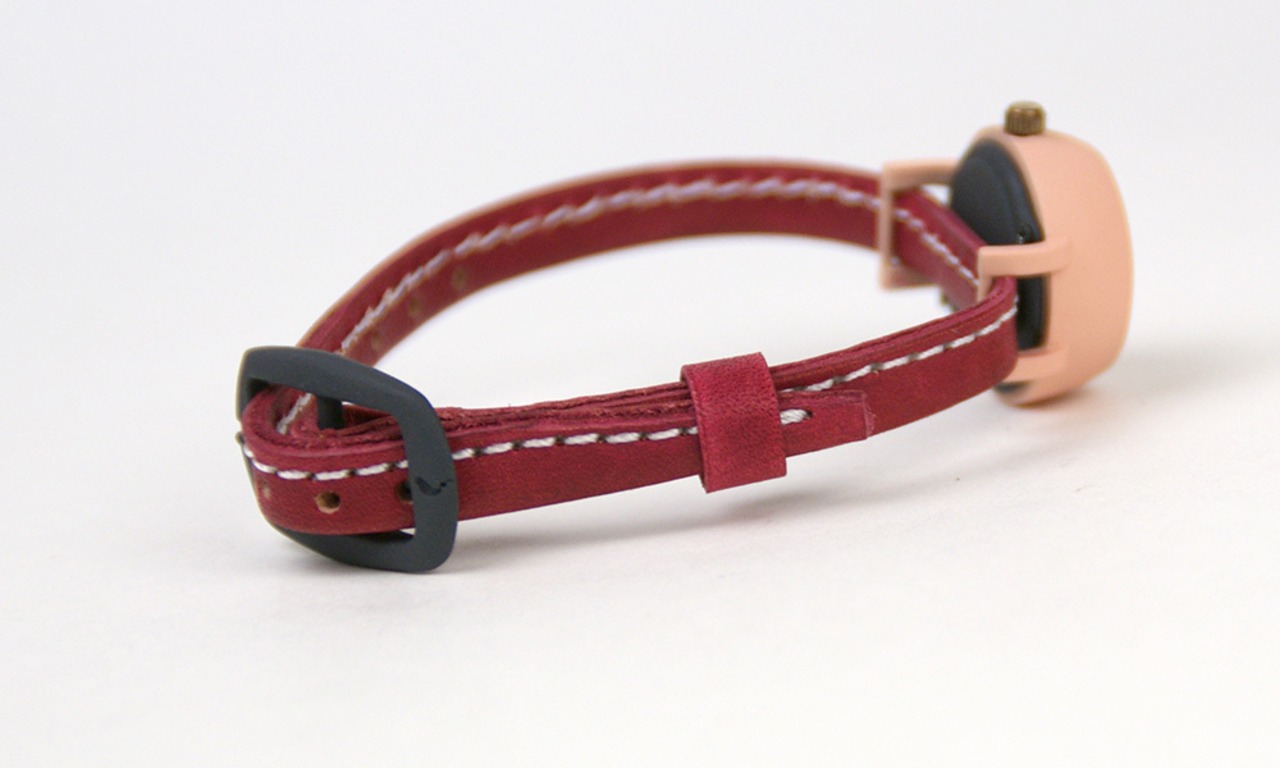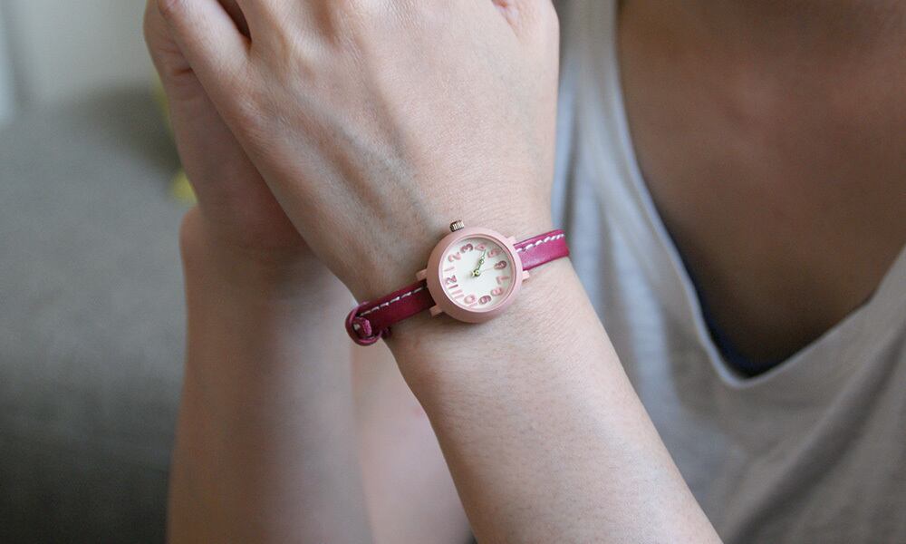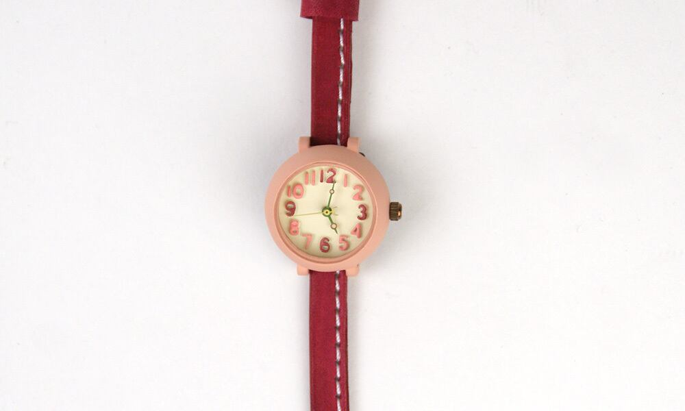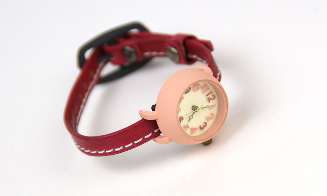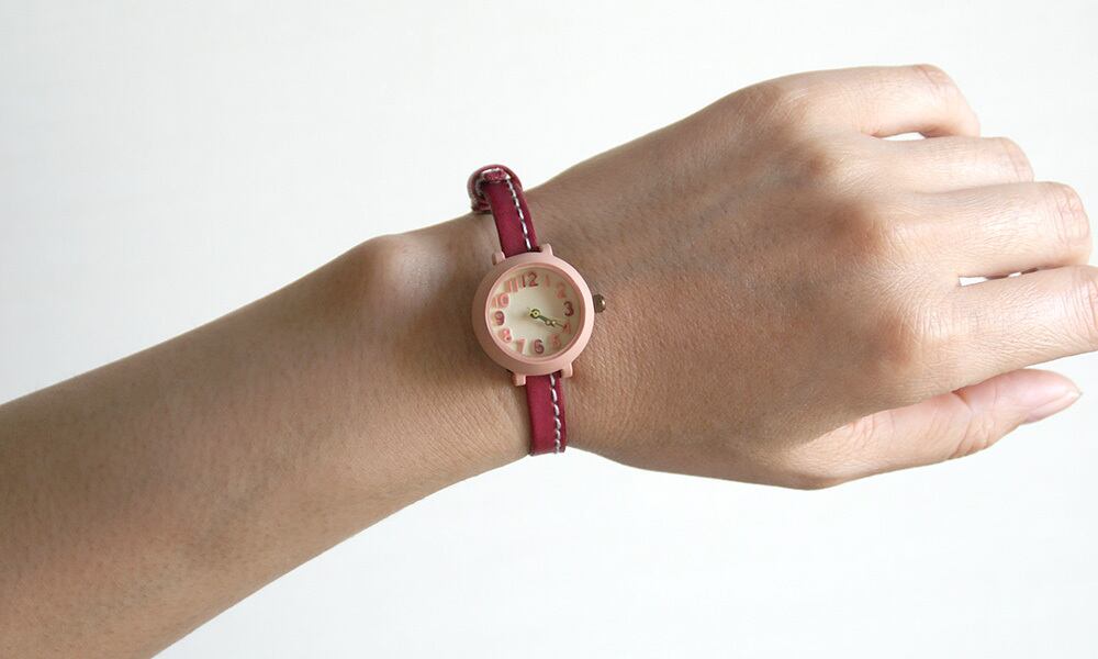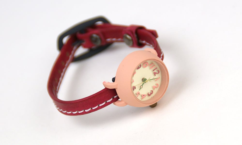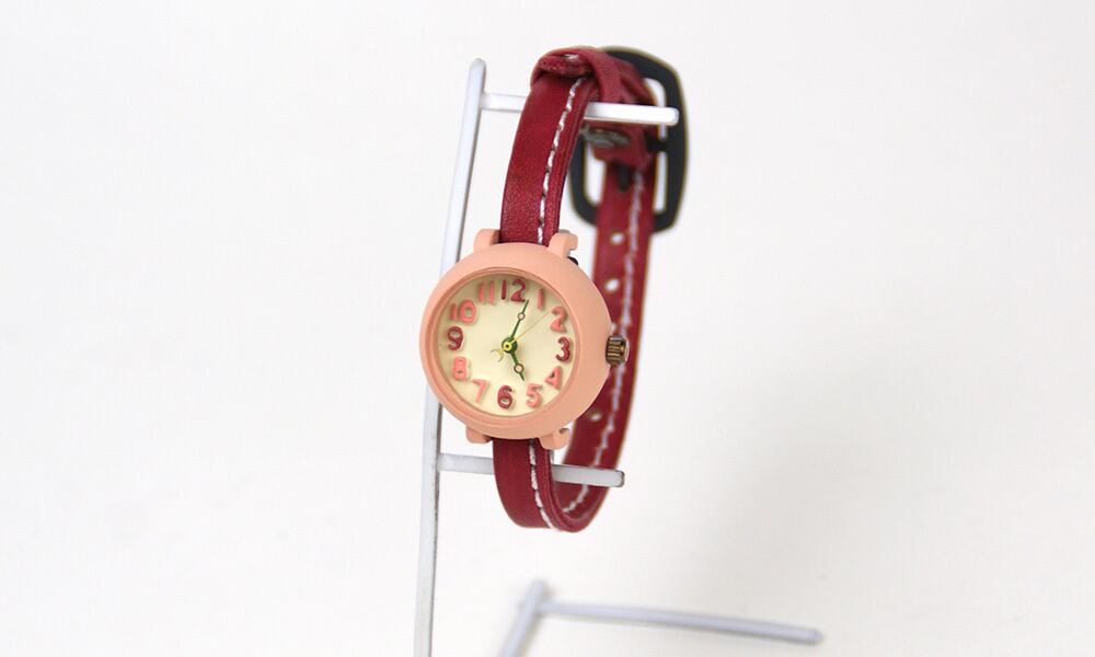 ハンドメイド感のあるカラフルでかわいい時計本体に、フリーハンドでカットしたような革ベルトを合わせました。