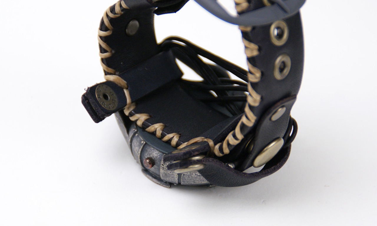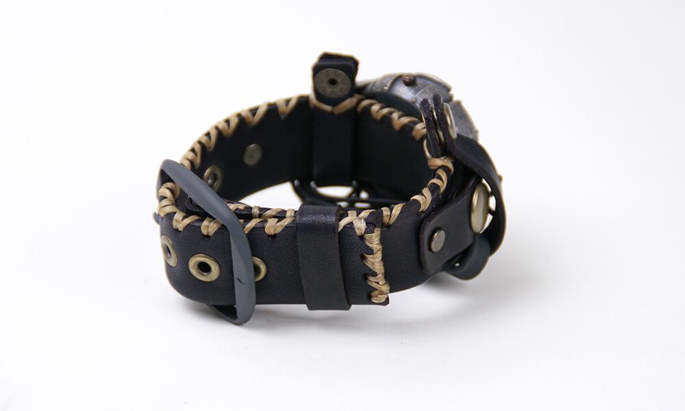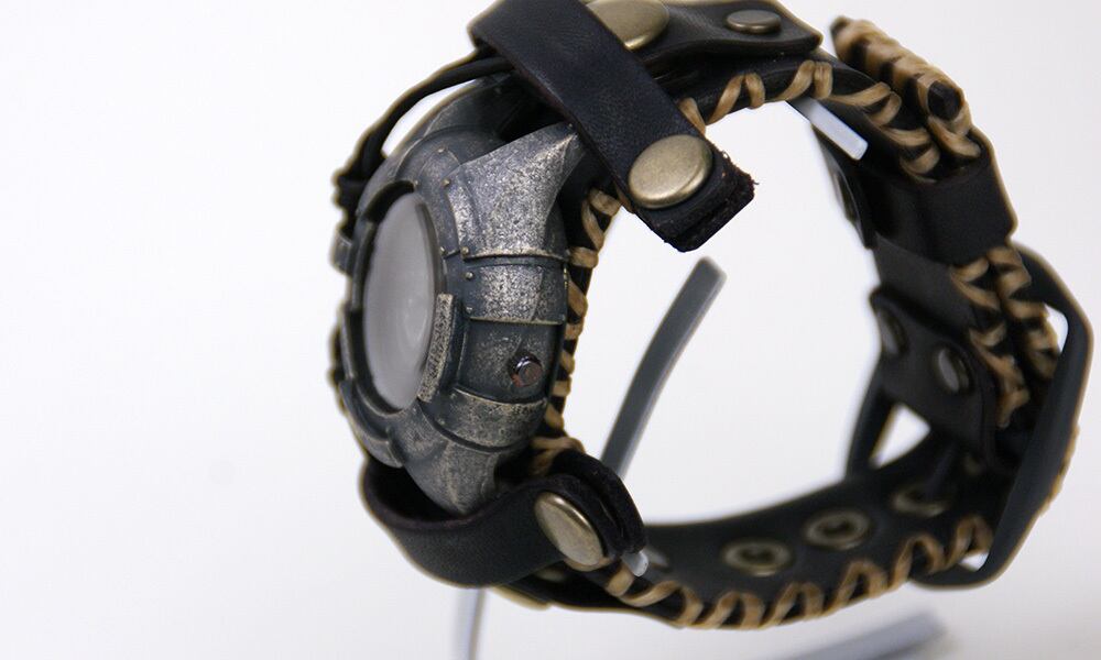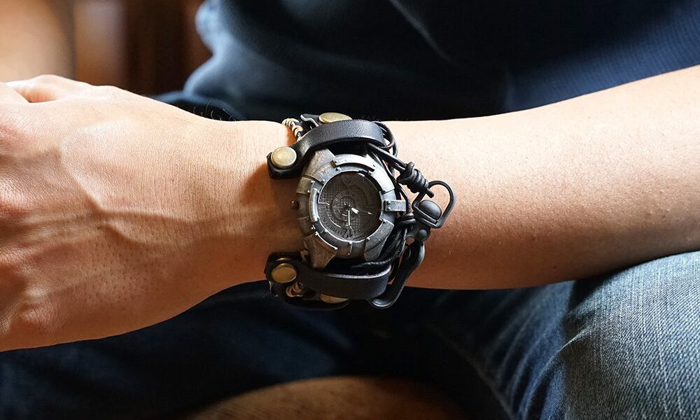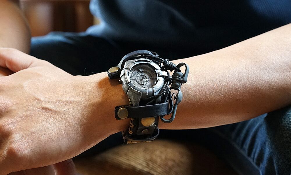 金属板を打ち付けたような取り外し可能な本体に、贅沢に革を使用した重厚な革の手縫いのバングルベルトをつけた、見たこともないような腕時計。