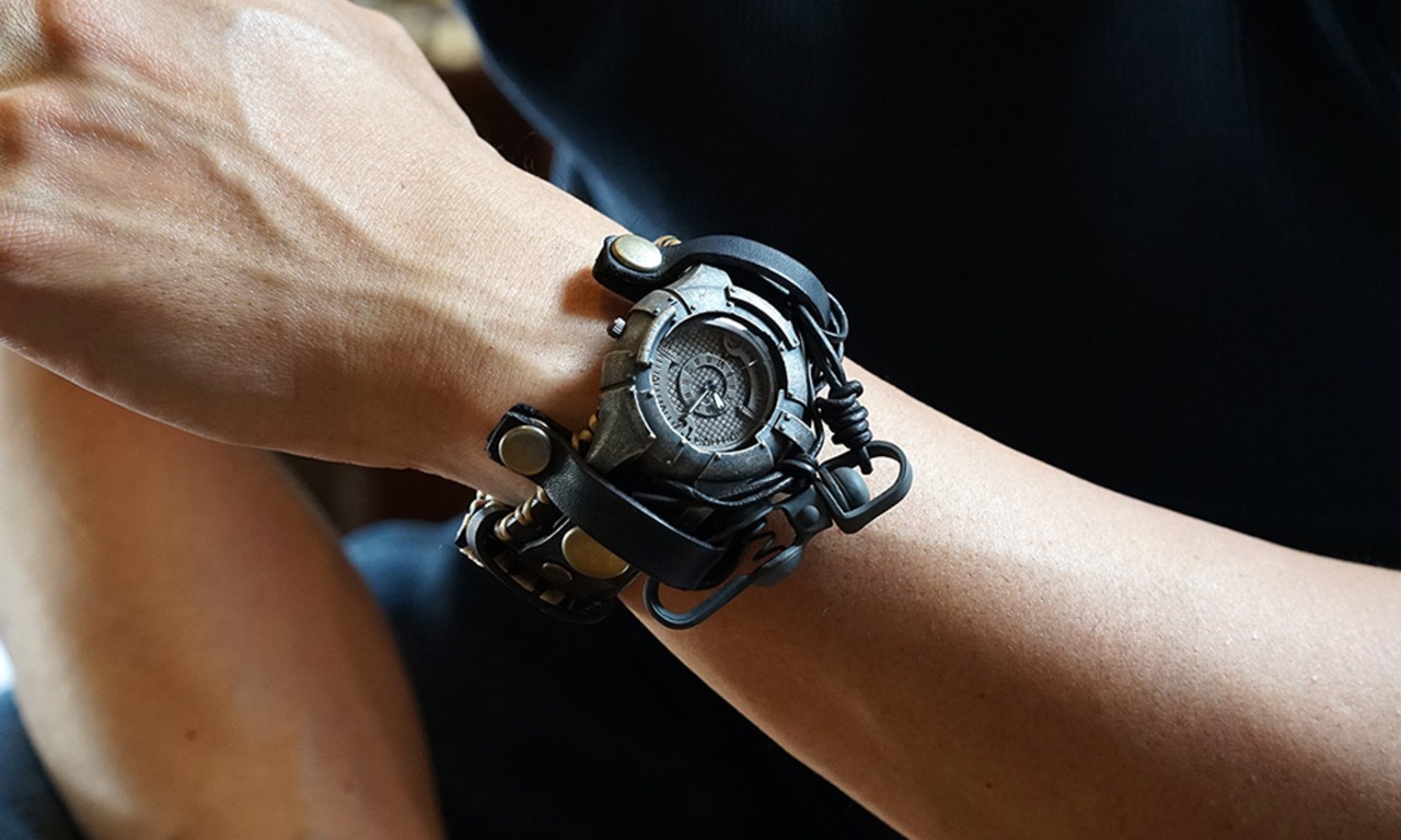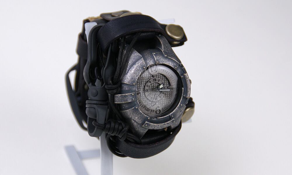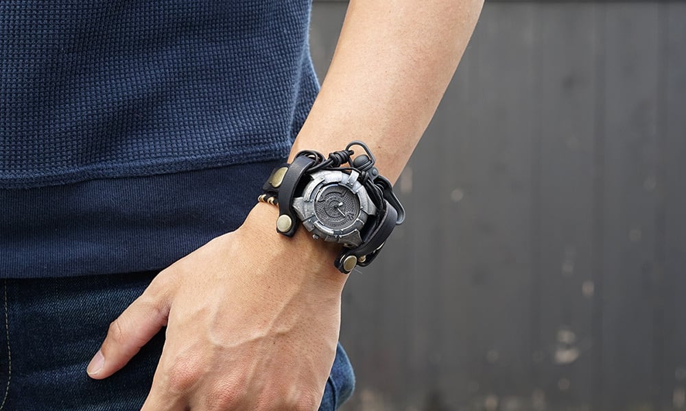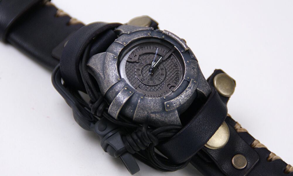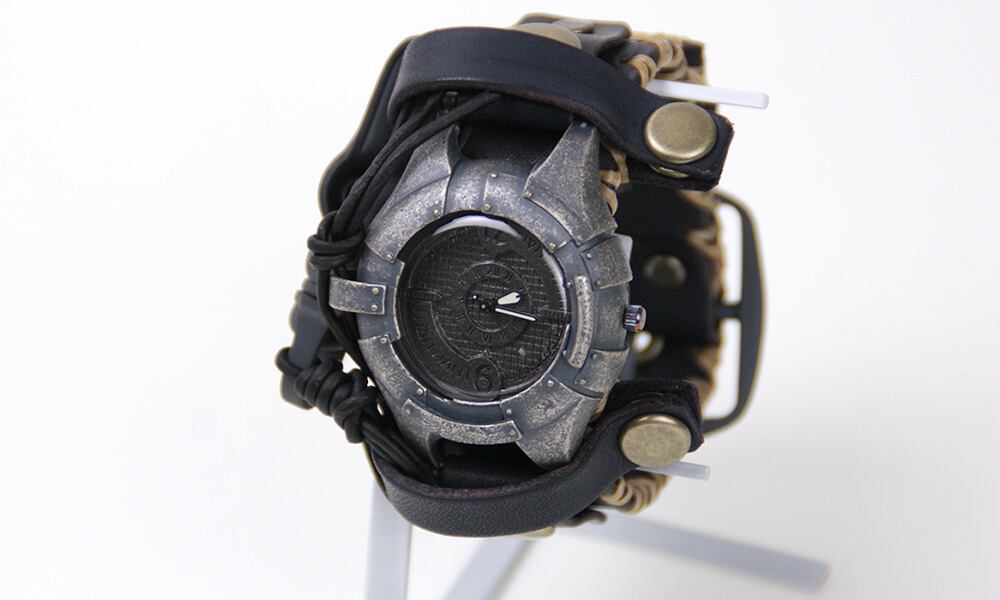金属板を打ち付けたような取り外し可能な本体に、贅沢に革を使用した重厚な革の手縫いのバングルベルトをつけた、見たこともないような腕時計。