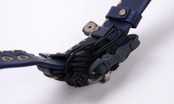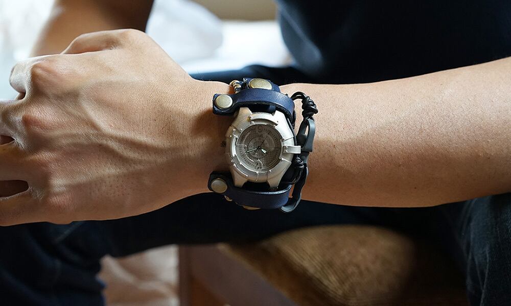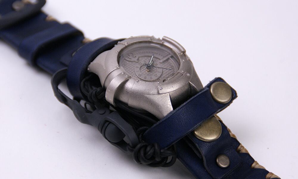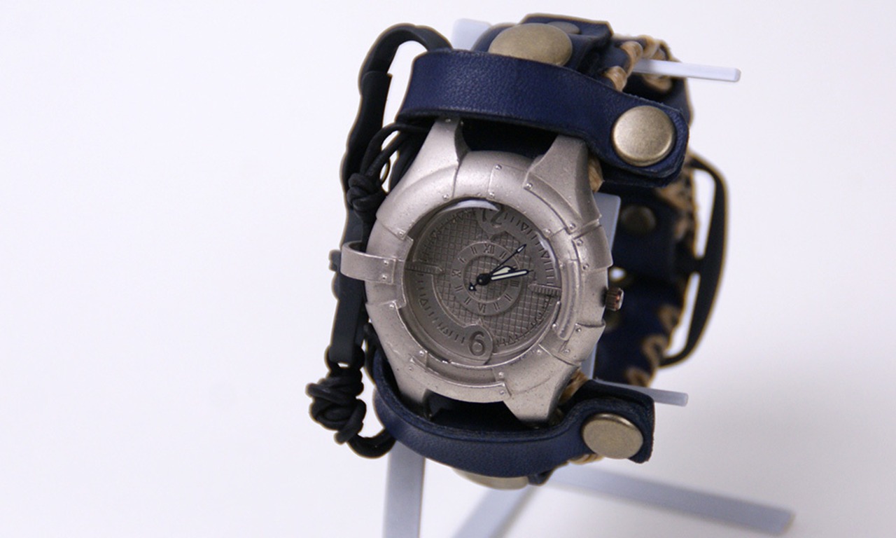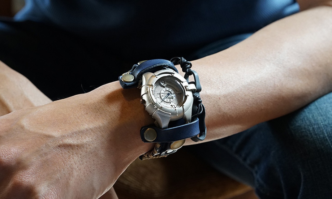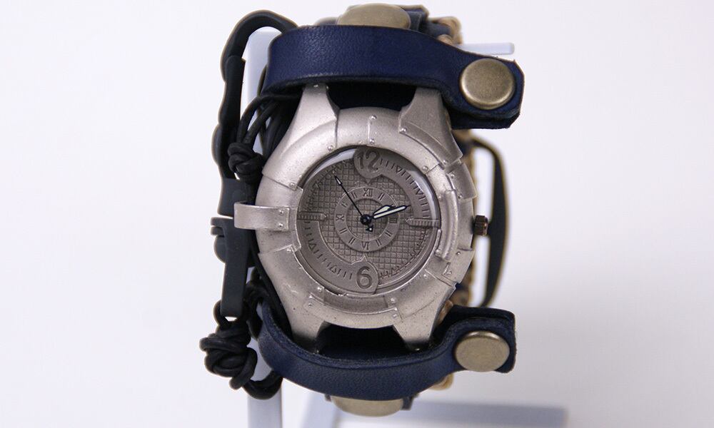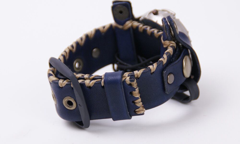 金属板を打ち付けたような取り外し可能な本体に、贅沢に革を使用した重厚な革の手縫いのバングルベルトをつけた、見たこともないような腕時計。