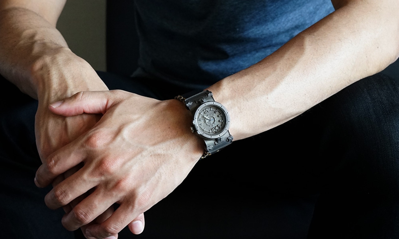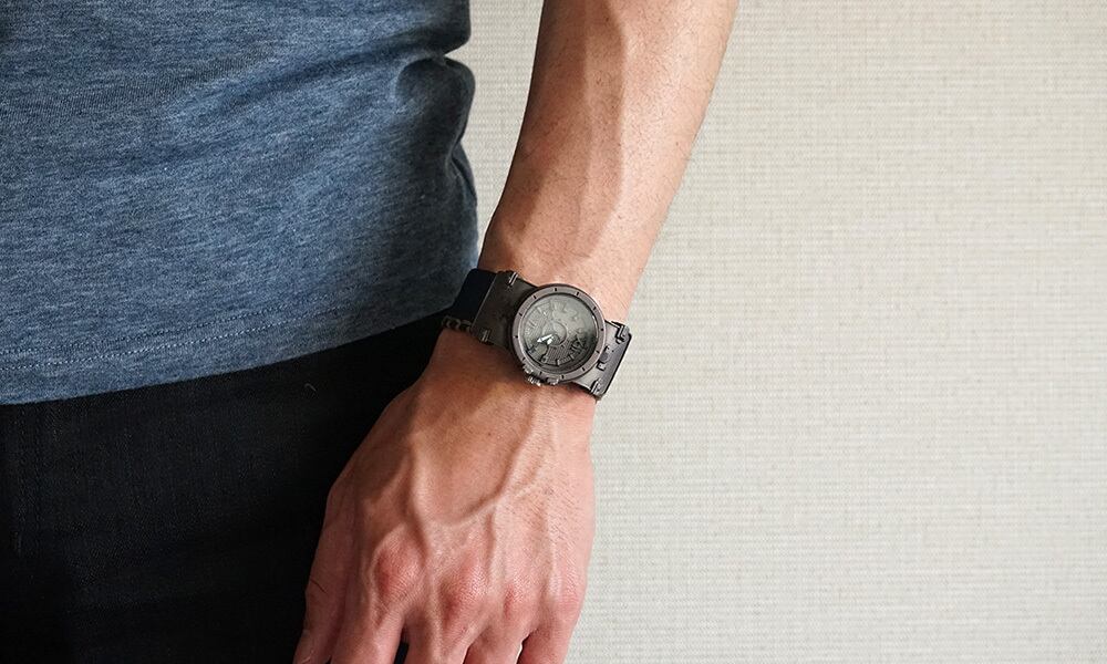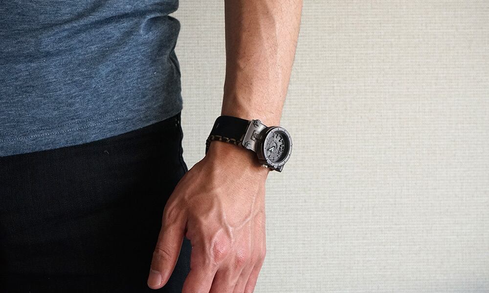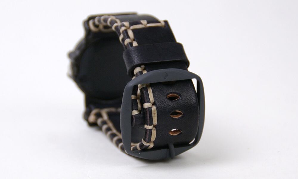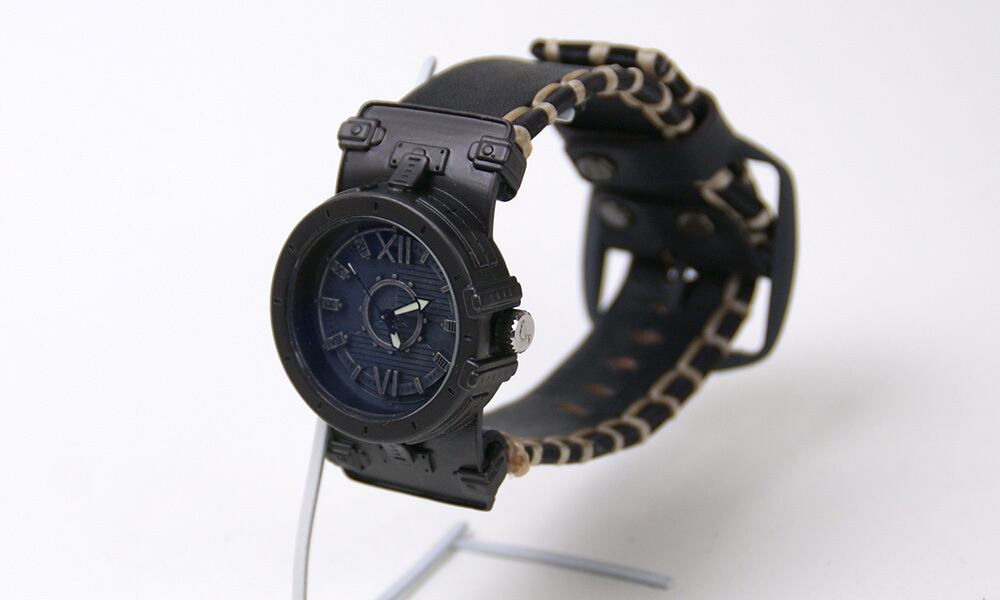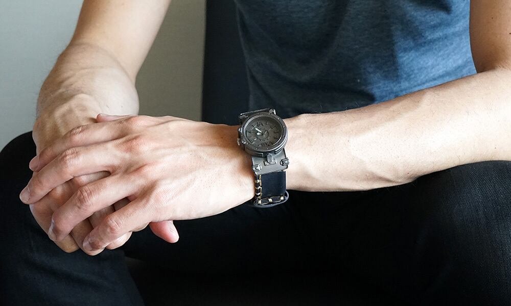 鉄片を組み合わせて作ったような時計に、無骨な厚めの手縫いの革ベルトが特徴の腕時計です。