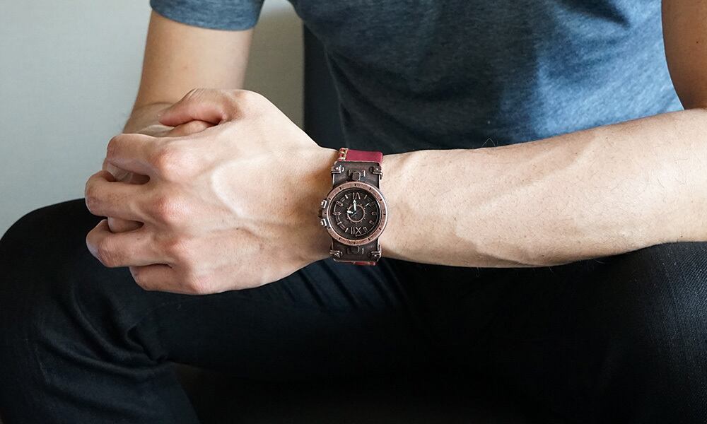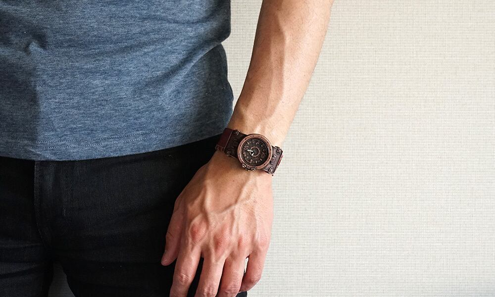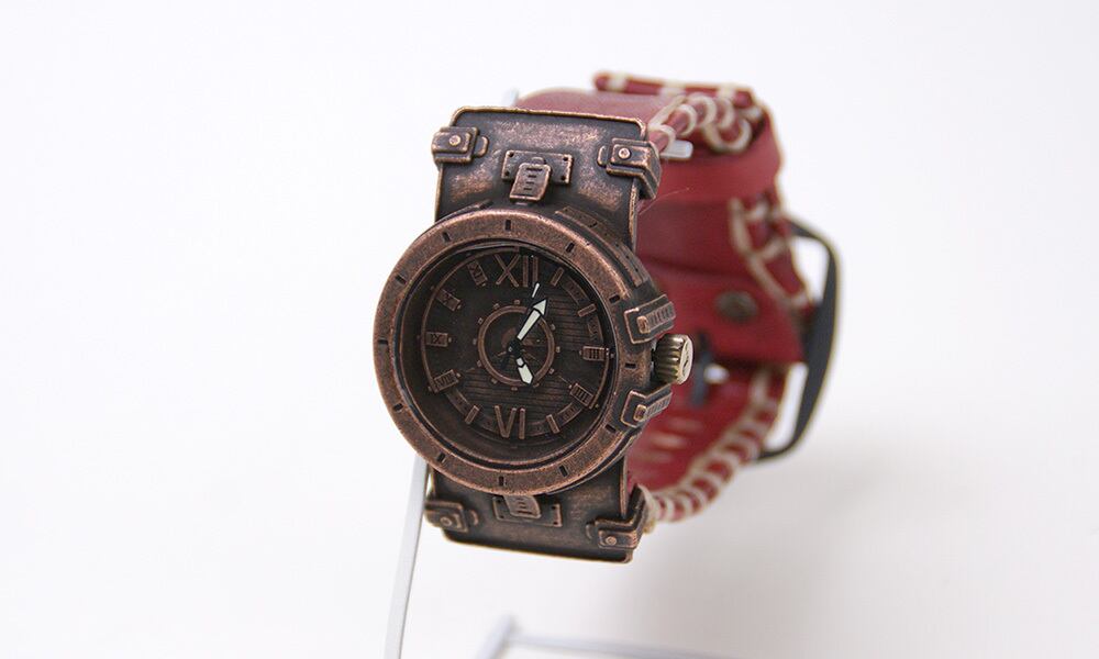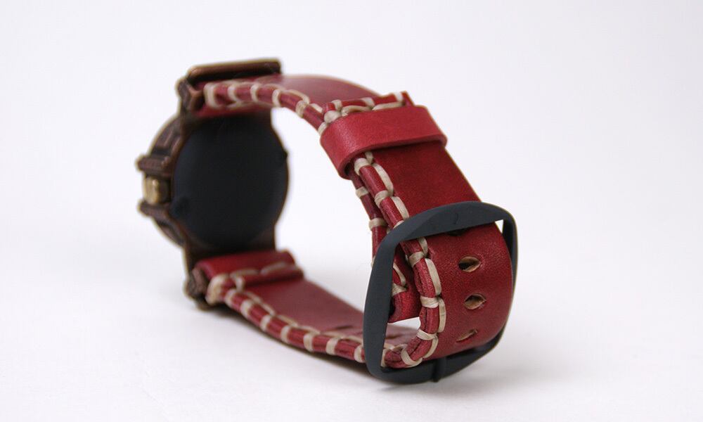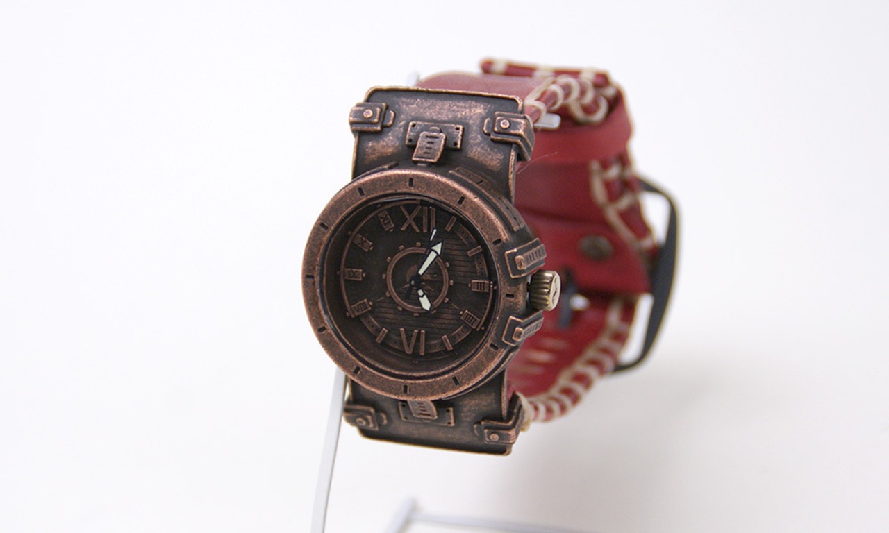 鉄片を組み合わせて作ったような時計に、無骨な厚めの手縫いの革ベルトが特徴の腕時計です。