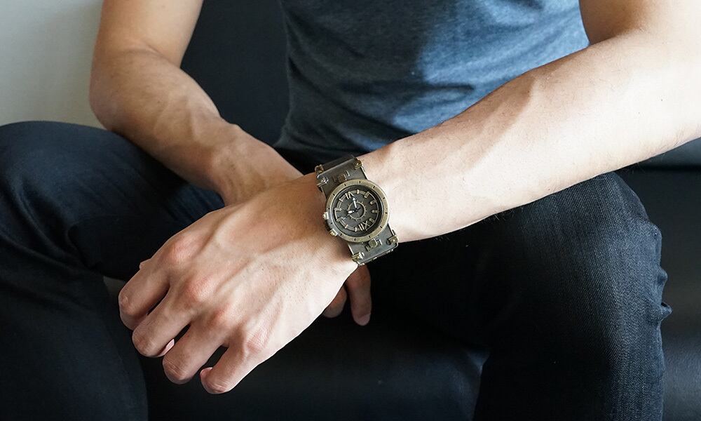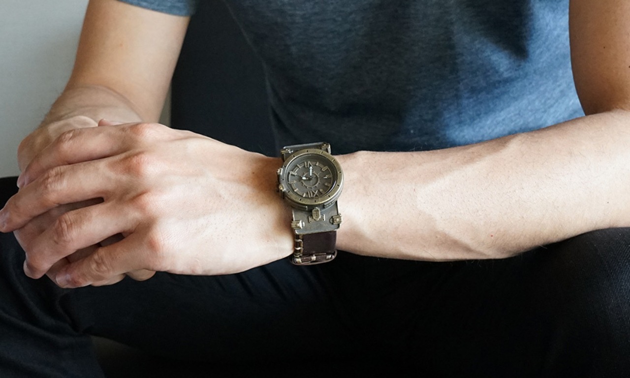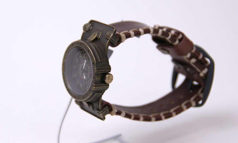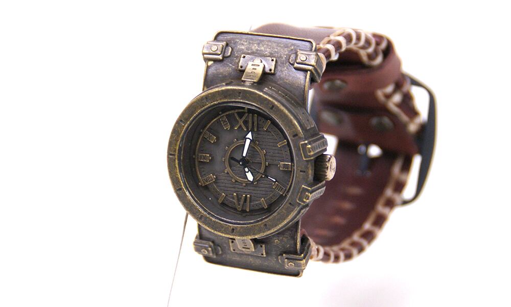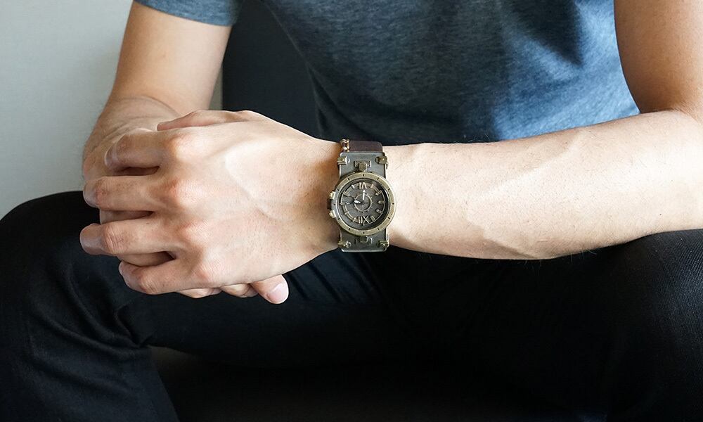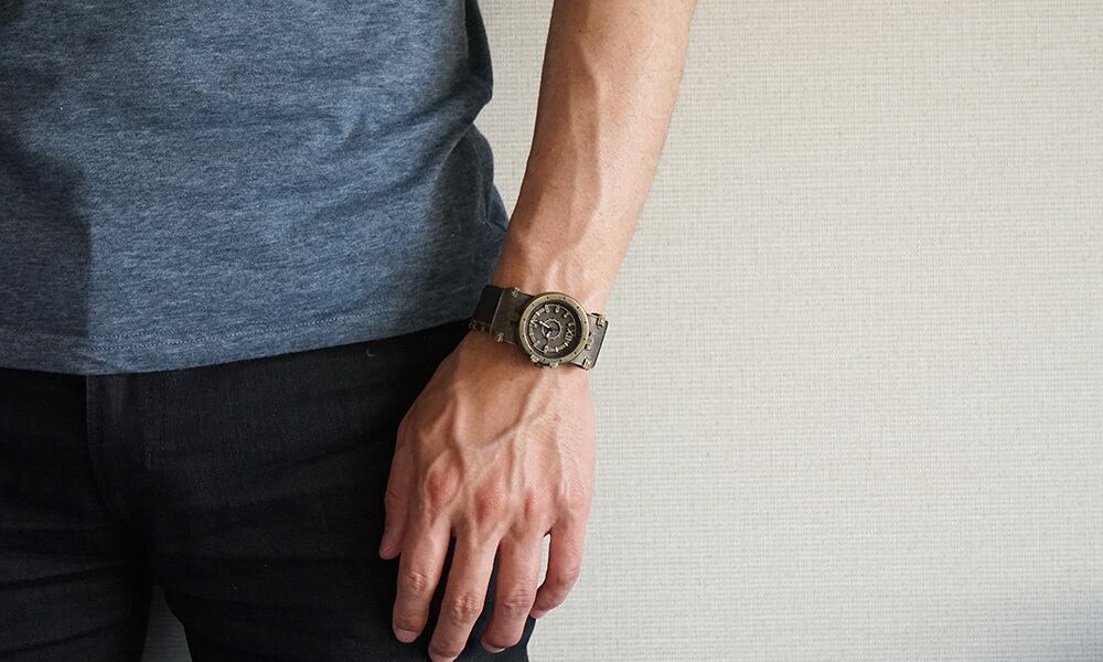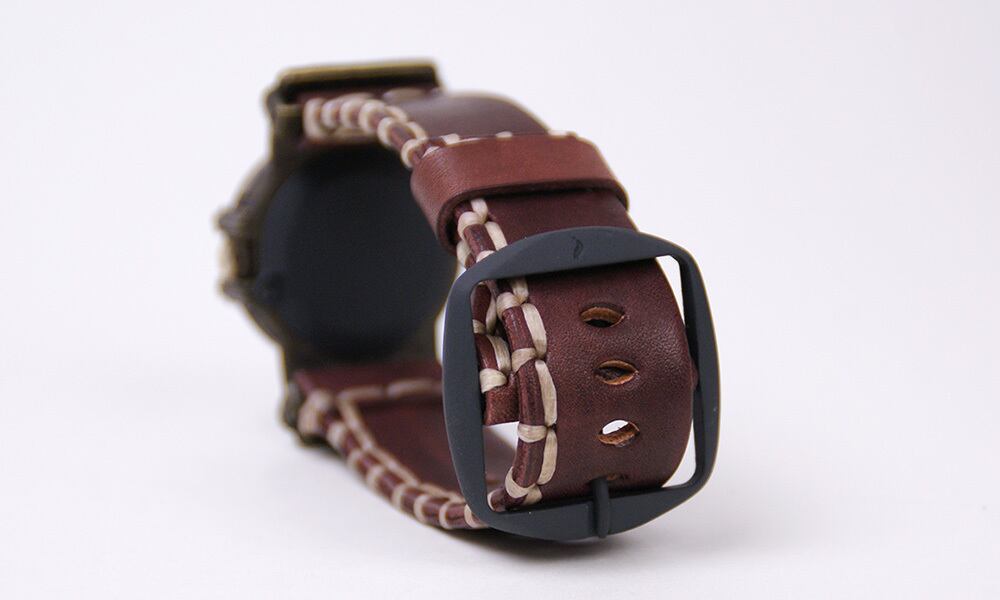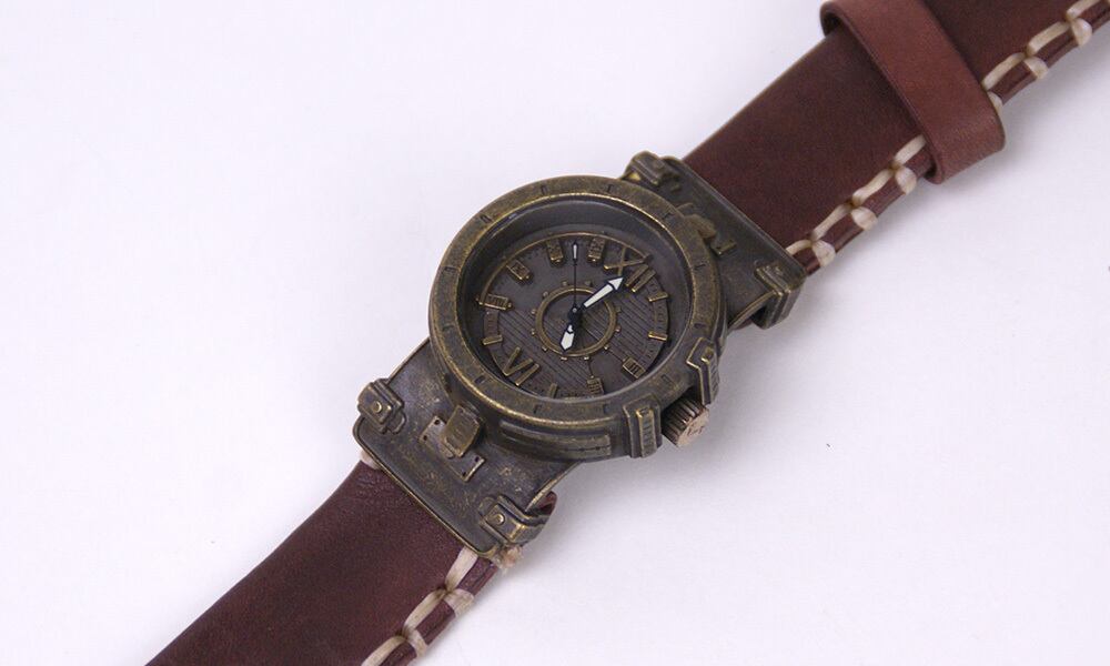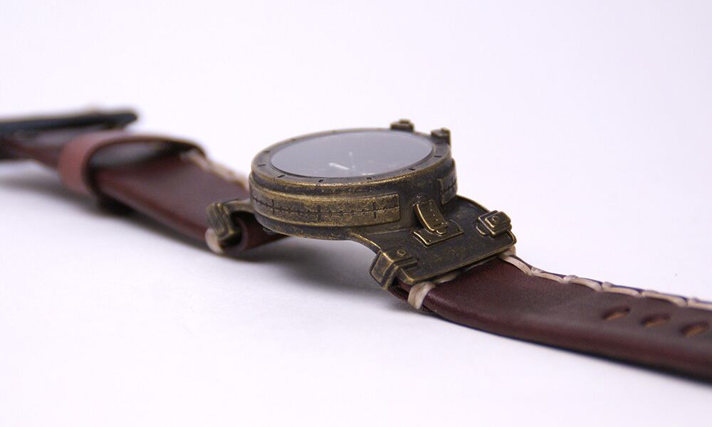 鉄片を組み合わせて作ったような時計に、無骨な厚めの手縫いの革ベルトが特徴の腕時計です。
