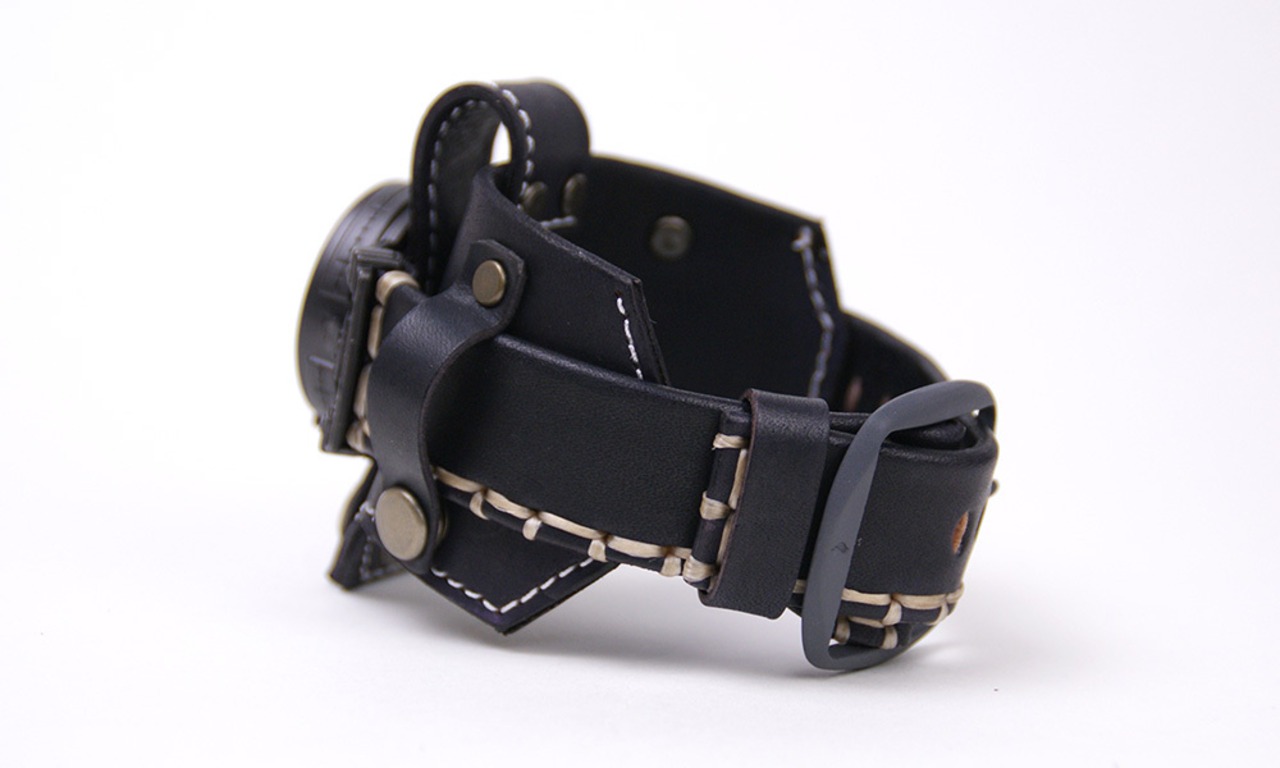 「本革バングル」・・・本革を贅沢に使用した両面銀面のバングル。時計のベルトは手縫いで、バングル部分は革ミシンで・・・とステッチを分けています。ステッチの色は固定です。