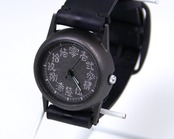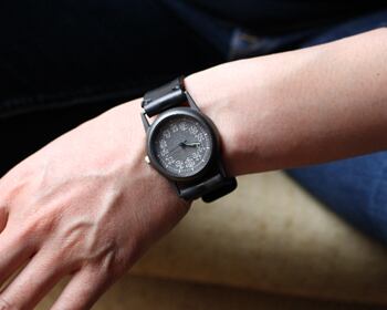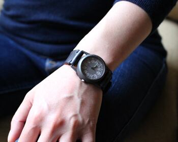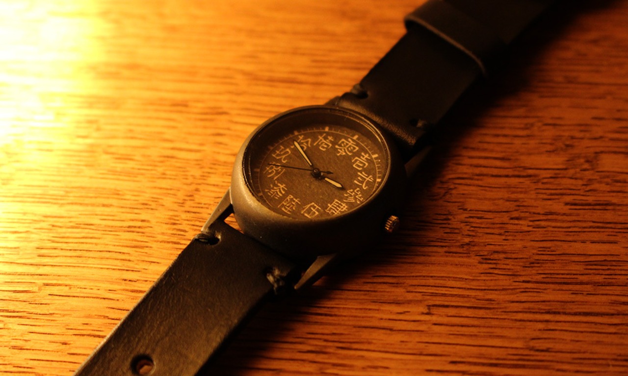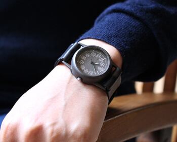 焼いて作ったような時計本体に、和紙に手書きで刻み入れた文字盤が特徴のシンプルな腕時計です。