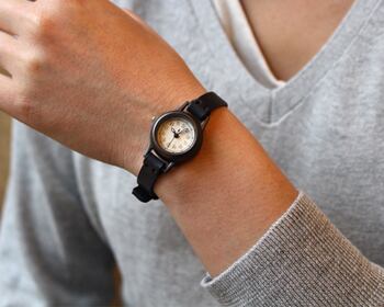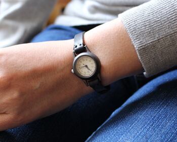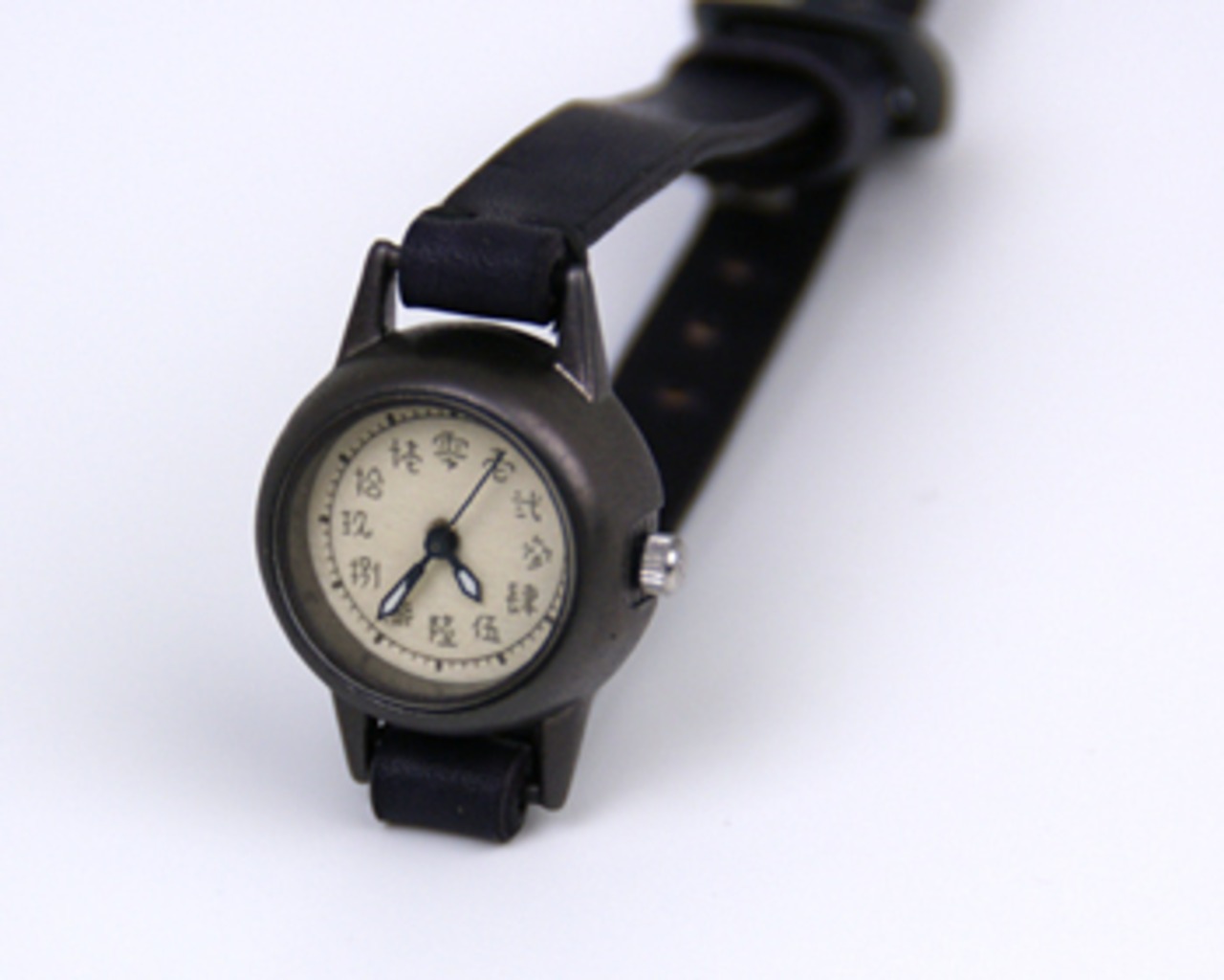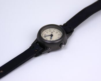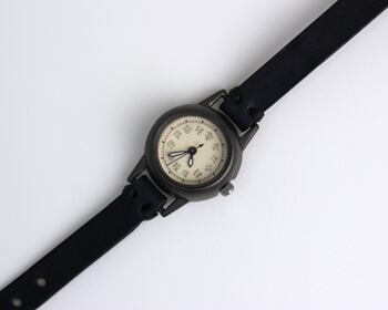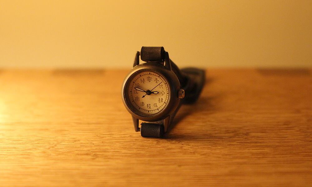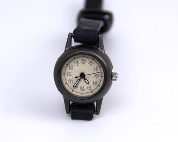 焼いて作ったような時計本体に、和紙に手書きで刻み入れた文字盤が特徴のシンプルな小さい腕時計。