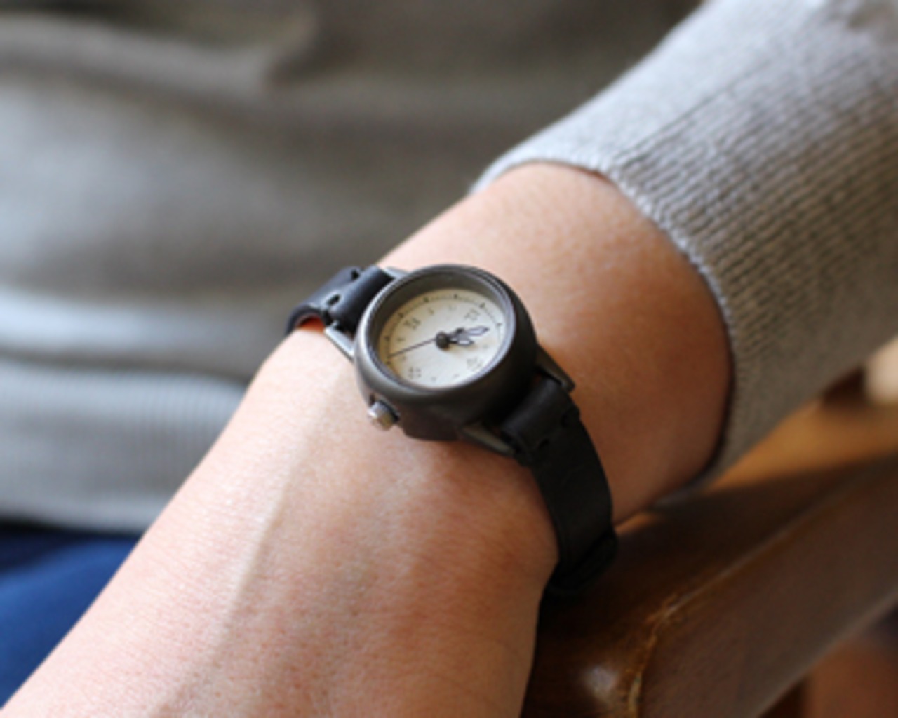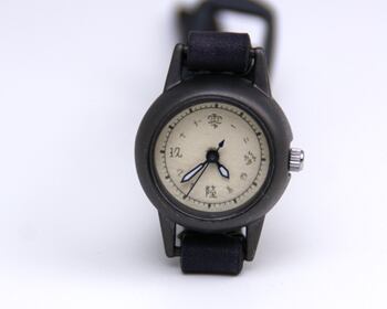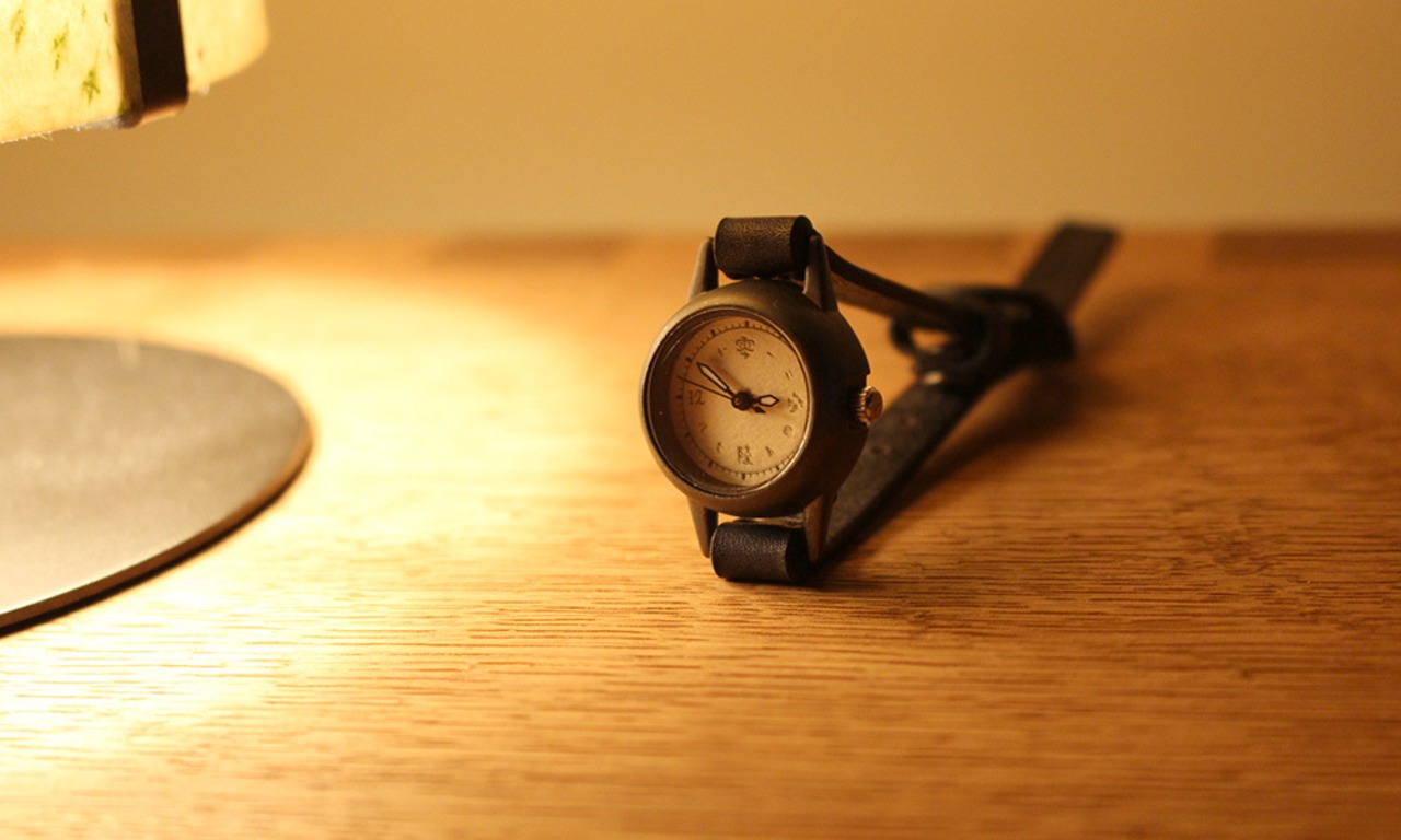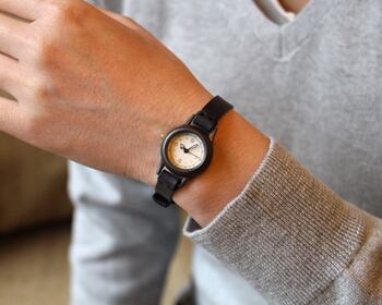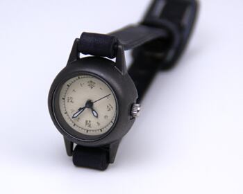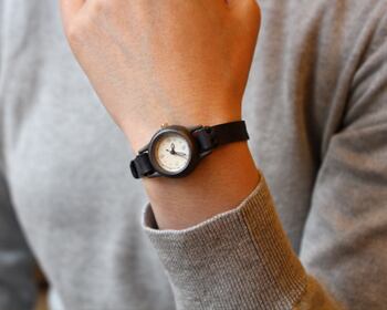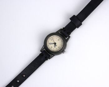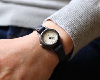 焼いて作ったような時計本体に、和紙に手書きで刻み入れた文字盤が特徴のシンプルな小さい腕時計。