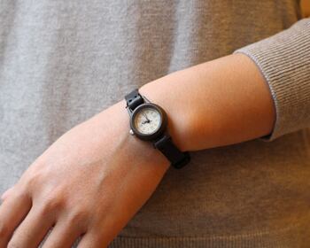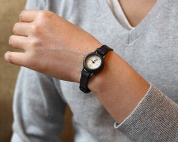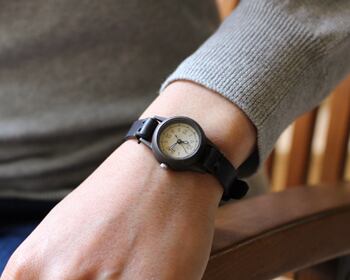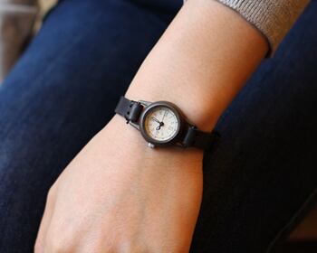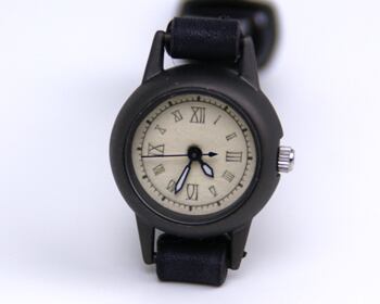 焼いて作ったような時計本体に、和紙に手書きで刻み入れた文字盤が特徴のシンプルな小さい腕時計。