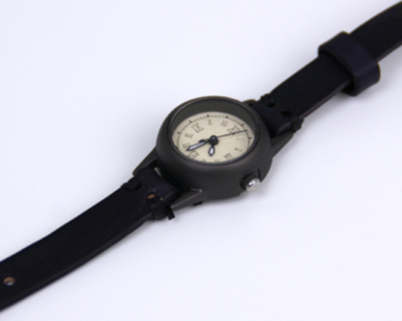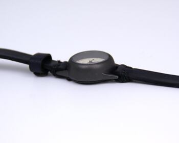 金属を焼き、叩き、作り上げたような時計本体は、ゆるやかなカーブを描いた直径23ミリの小さな時計。