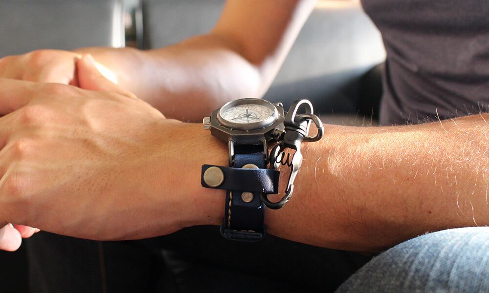 「手縫いの本革ベルト」・・・1枚の革を2倍の幅に切り、手縫いで一針一針縫い合わせた両面銀面(革のツルツルした良い面)のバングルです。Hushと似ていますが、この時計のために片側縫いにするなど、少しアレンジしています。