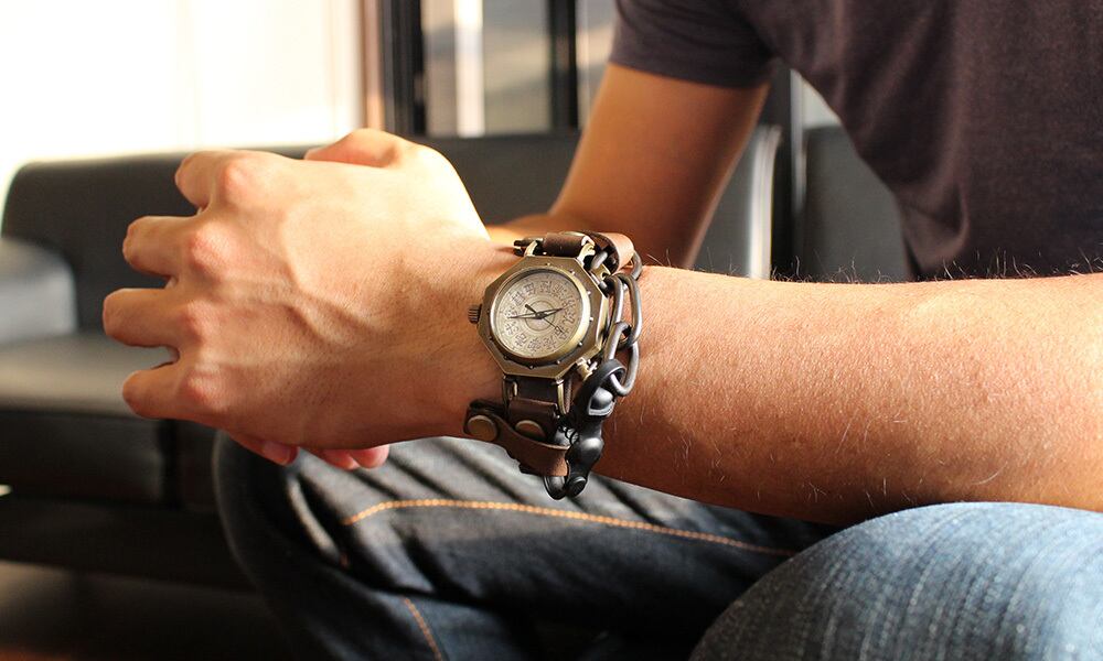 無者レザク時計の時計本体と、Hushのバングルをアレンジしたベルトを合わせた個性的な腕時計です。