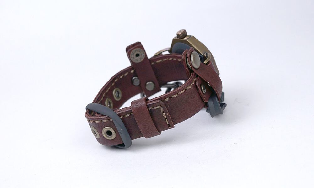 「手縫いの本革ベルト」・・・1枚の革を2倍の幅に切り、手縫いで一針一針縫い合わせた両面銀面(革のツルツルした良い面)のバングルです。Hushと似ていますが、この時計のために片側縫いにするなど、少しアレンジしています。