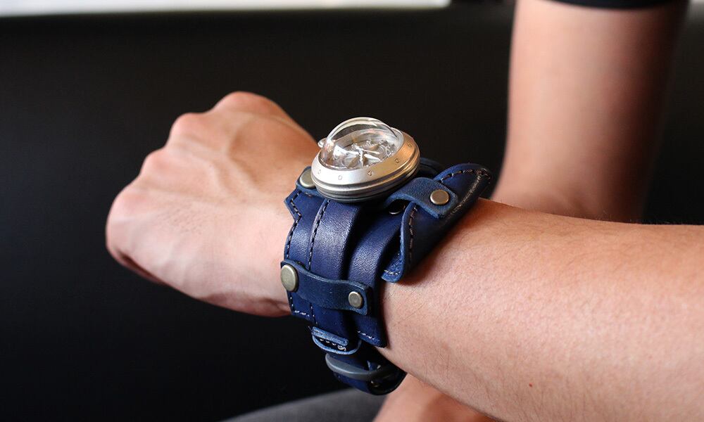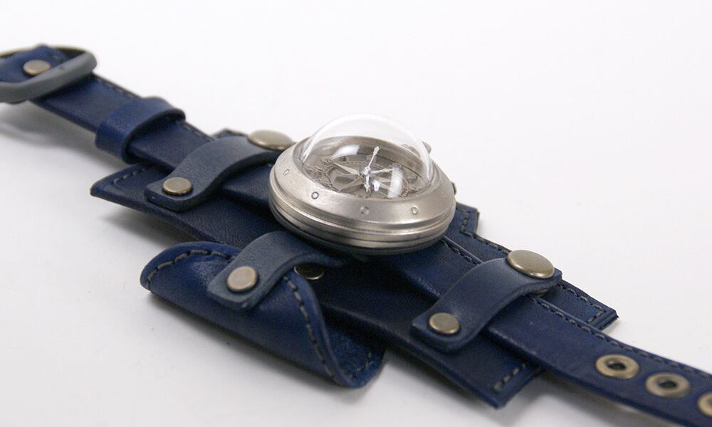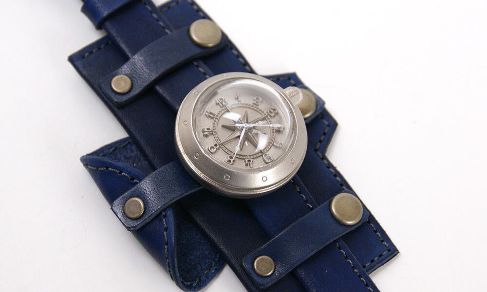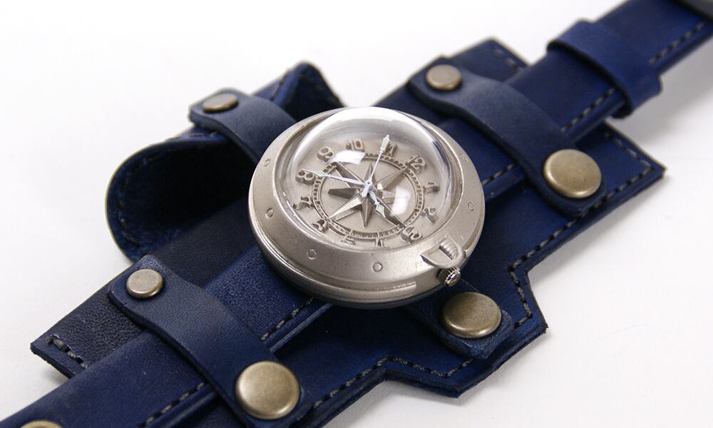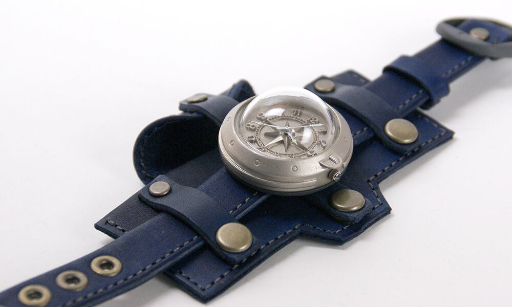 「NamiRevo」シリーズの「半球型のかわいいレンズ」「船の窓のような本体」「方位盤をイメージした文字盤」などの特徴はそのままにメタリックなイメージに一新した時計に、着せ替え可能なインパクトのある革バングルを合わせた個性的な腕時計です。
