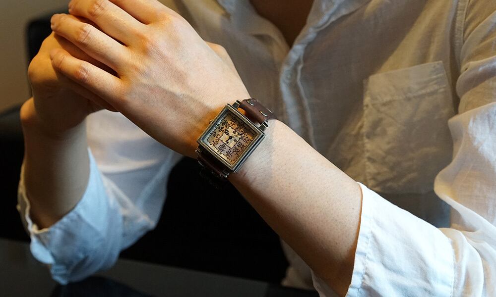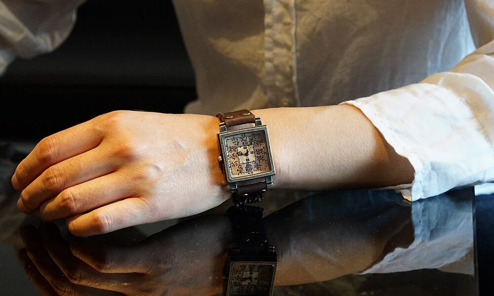 「文字盤」・・・まるでそこだけ時間の流れが違うような不思議な雰囲気の文字盤のデザインです。時計を見るたびに落ち着いた気持ちに。