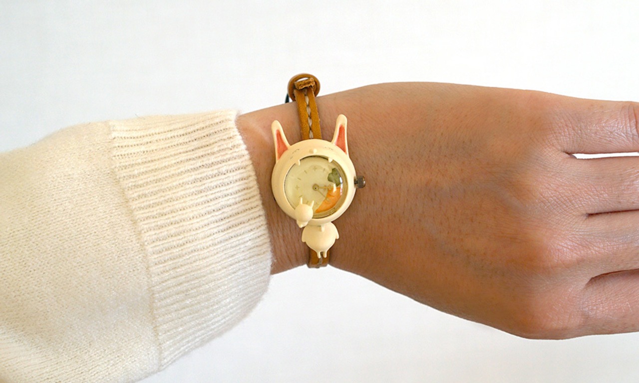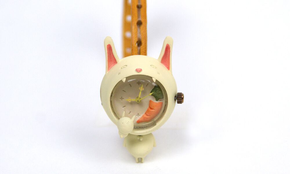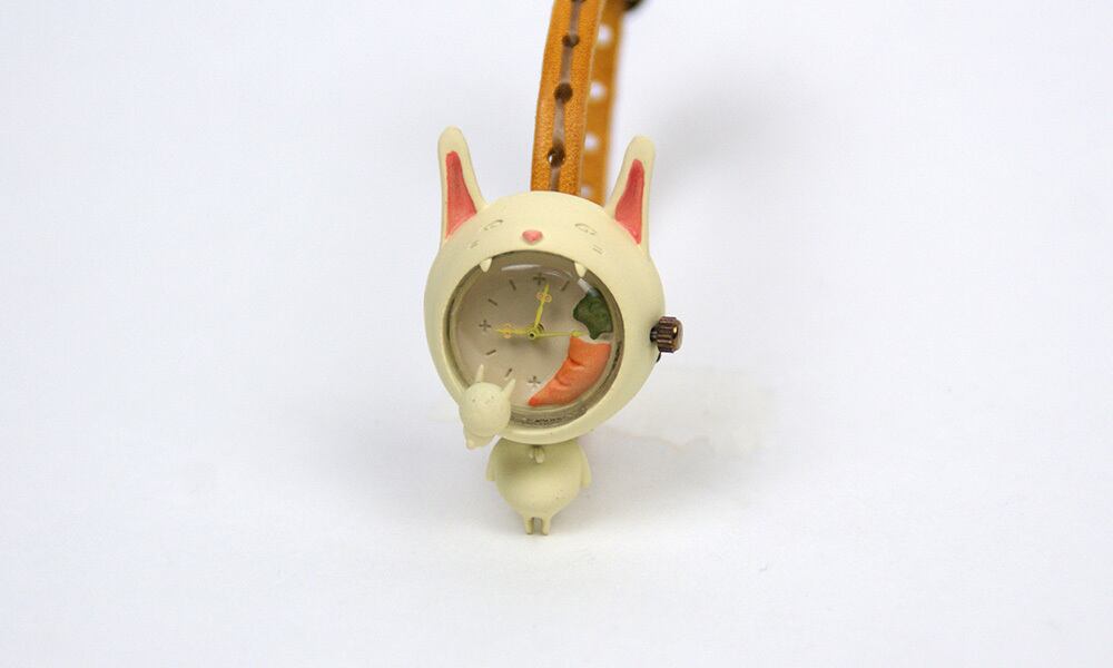 口に入れたニンジンを仔ウサギに奪われ続けているのに、気づかない、そんな白うさぎの腕時計です。