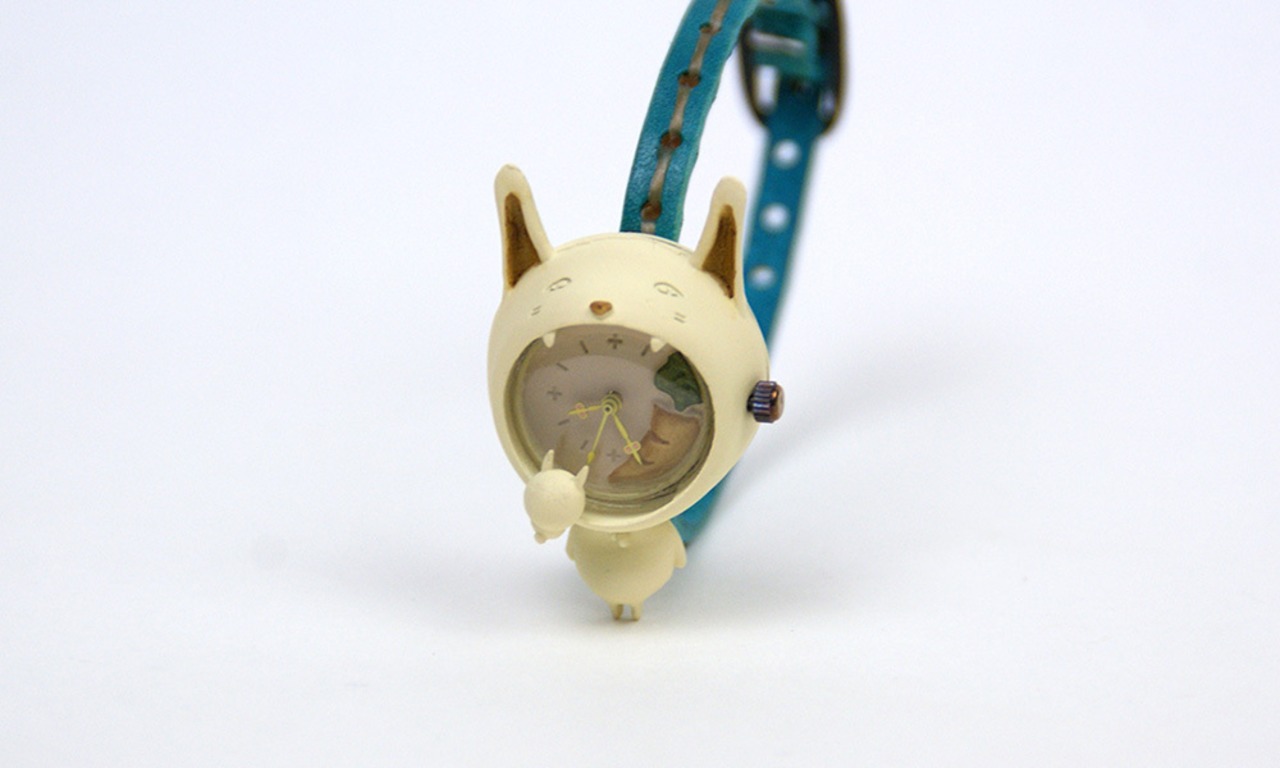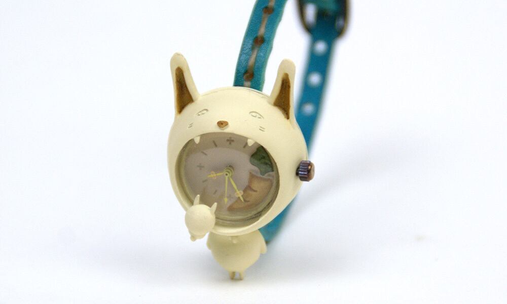 口に入れたニンジンを仔ウサギに奪われ続けているのに、気づかない、そんな白うさぎの腕時計です。