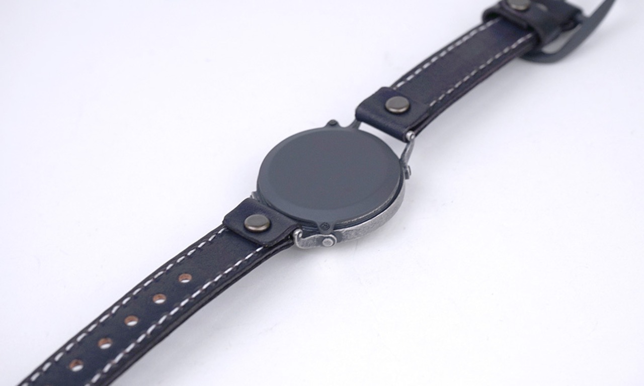 「時計本体」・・・Classicaシリーズ共通の直径約3.5センチの絶妙な大きさの時計本体は、本体と革をつなぐ部分に、勾玉をイメージしてデザインした金具をそっと配置しています。