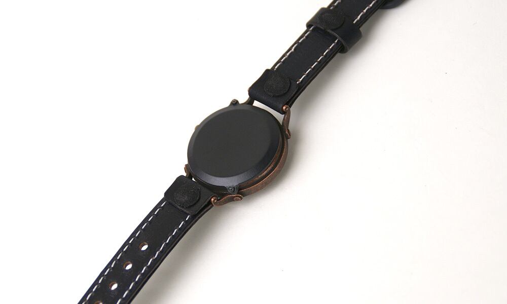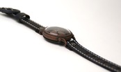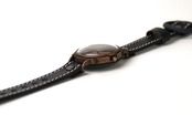 「時計本体」・・・直径約3.5センチの絶妙な大きさの時計本体は、本体と革をつなぐ部分に、勾玉をイメージしてデザインした金具をそっと配置しました。