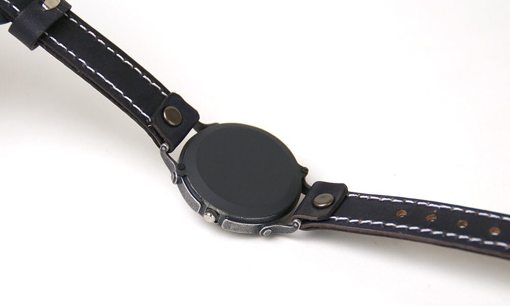 「時計本体」・・・直径約3.5センチの絶妙な大きさの時計本体は、本体と革をつなぐ部分に、勾玉をイメージしてデザインした金具をそっと配置しました。