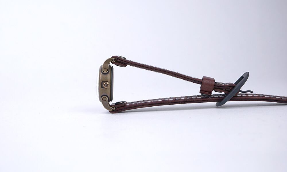 「本革ベルト」・・・シンプルなデザインの本革ベルト。シンプルとはいえ、両面銀面(革のつるつるした面)で縫い上げた高級仕様。手塗りの独特の雰囲気も合わせ持つ本革ベルトです。この時計は他のCartaシリーズと異なり、ベルトに使う金具の一部の色と素材を変更しています。