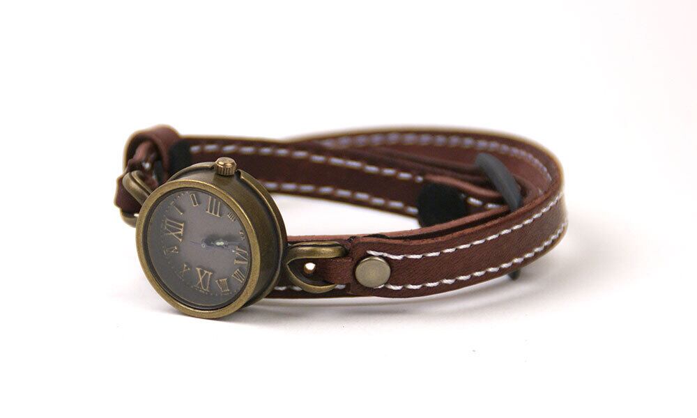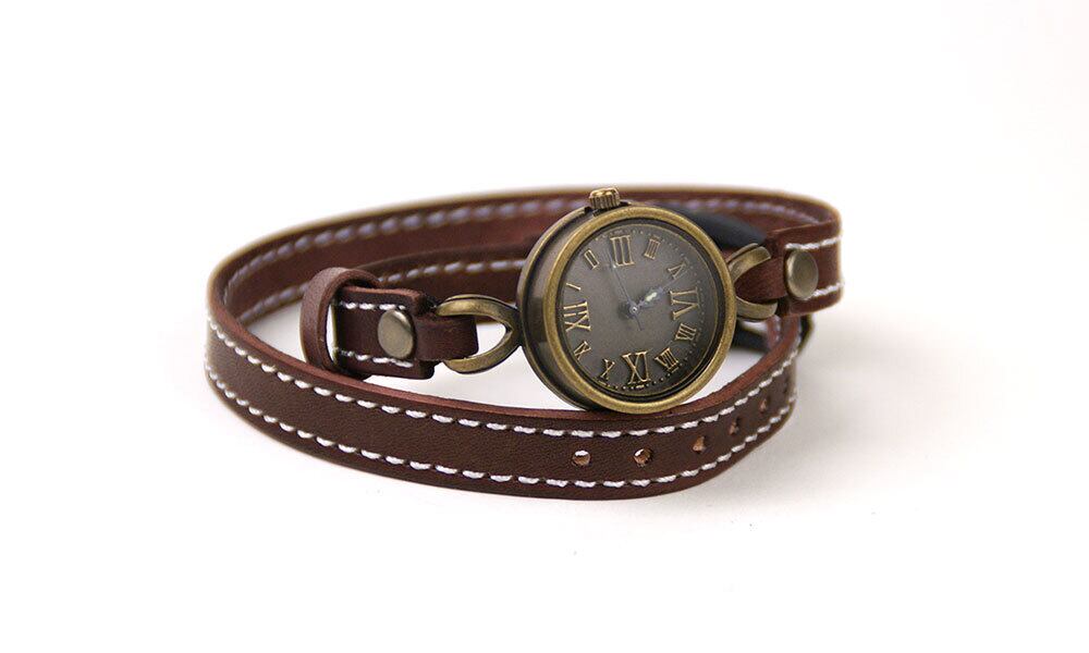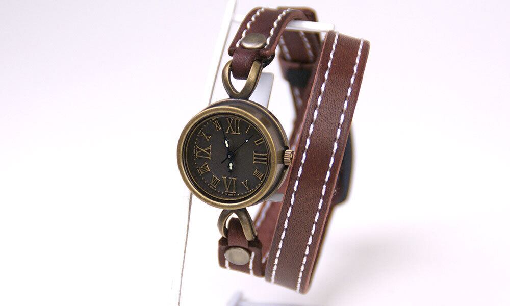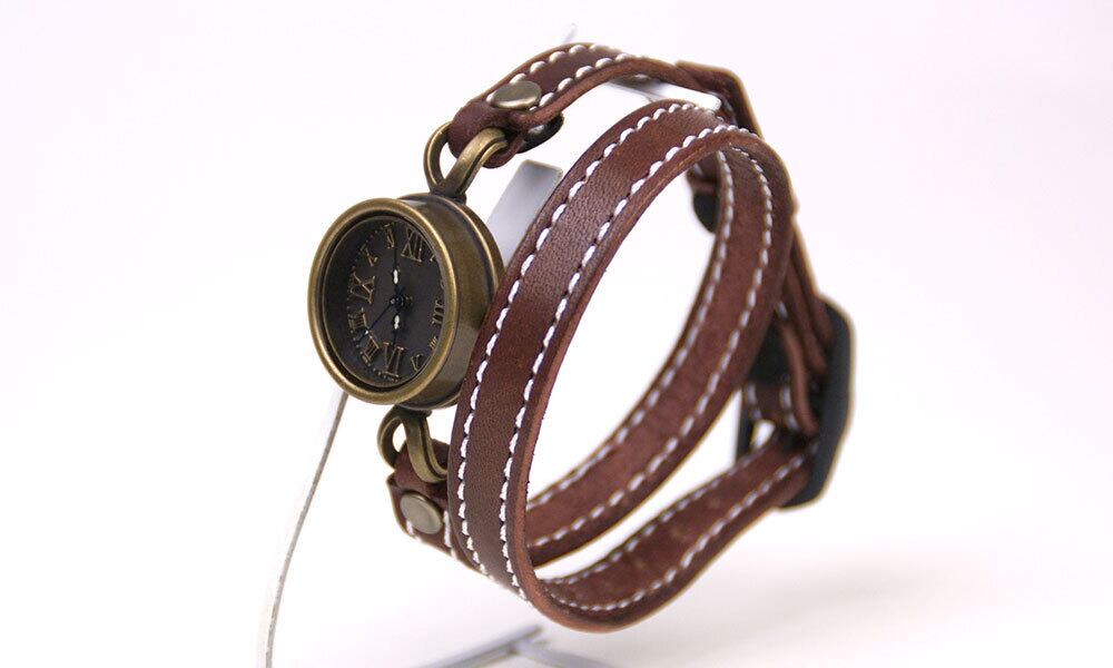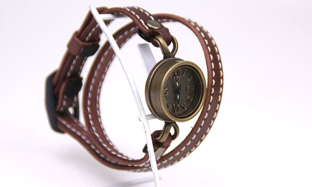 ミシン縫いの高級感のある2重巻きのバングルと、深みのあるアンティークな時計が組み合わさったクールな腕時計です。