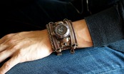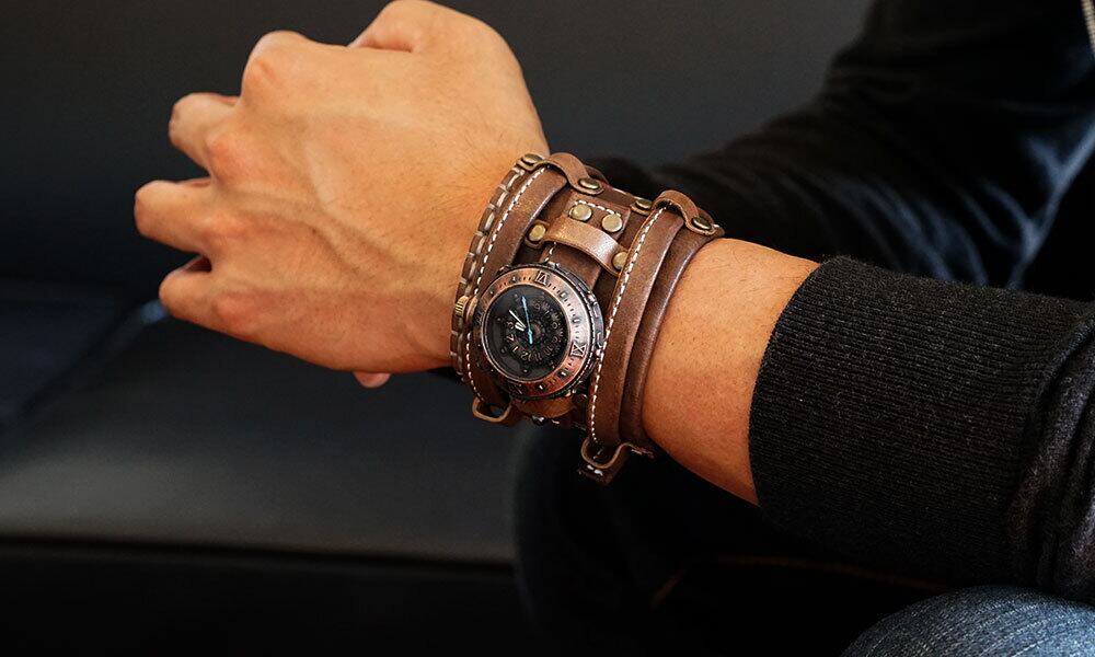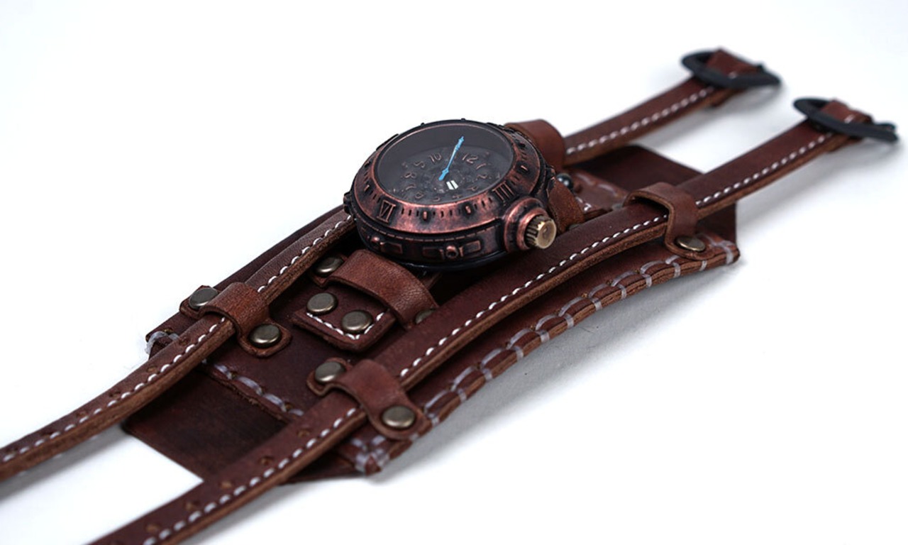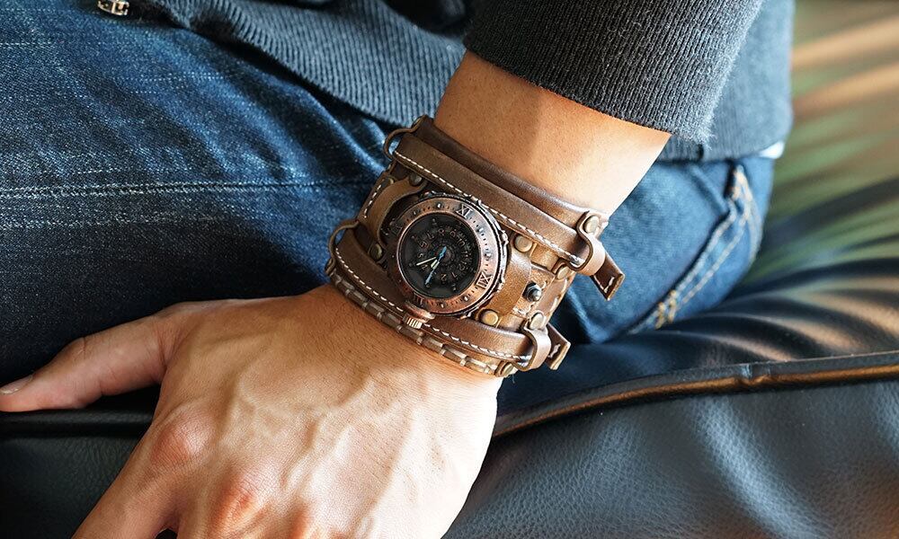 船の舵を模した文字盤、時代を経たような雰囲気の本体、手縫いの革バングル、ミシン縫いの2本の革ベルトなどが特徴のバングルウォッチです。