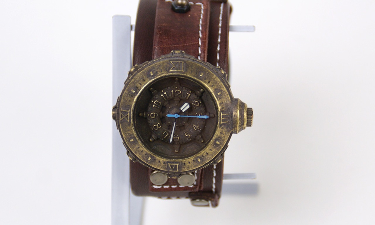 「文字盤」・・・船の舵をモチーフにしてデザインしています。チューブ型に盛り上げられた舵には、オリジナルで描いた数字でチューブにそって配置されています。