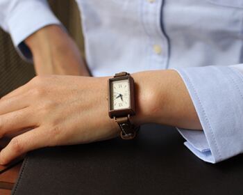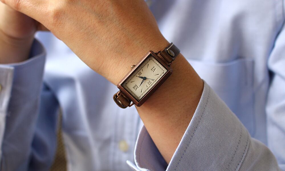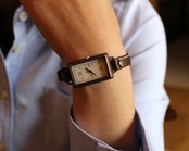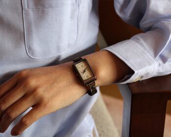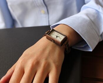 約3.3センチ×約2.3センチのややコンパクトな矩形の時計本体と、シンプルながら飽きのこない文字盤は、必要以上のモノを求めない洗練された雰囲気を持つ人に与えてくれます。