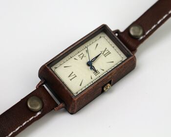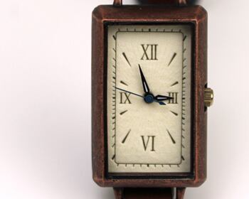 3センチ×2センチのややコンパクトな文字盤は、繊維感のある紙にシンプルなデザインを刻印することで、一見シンプルながら飽きのこない時計に仕上げています。